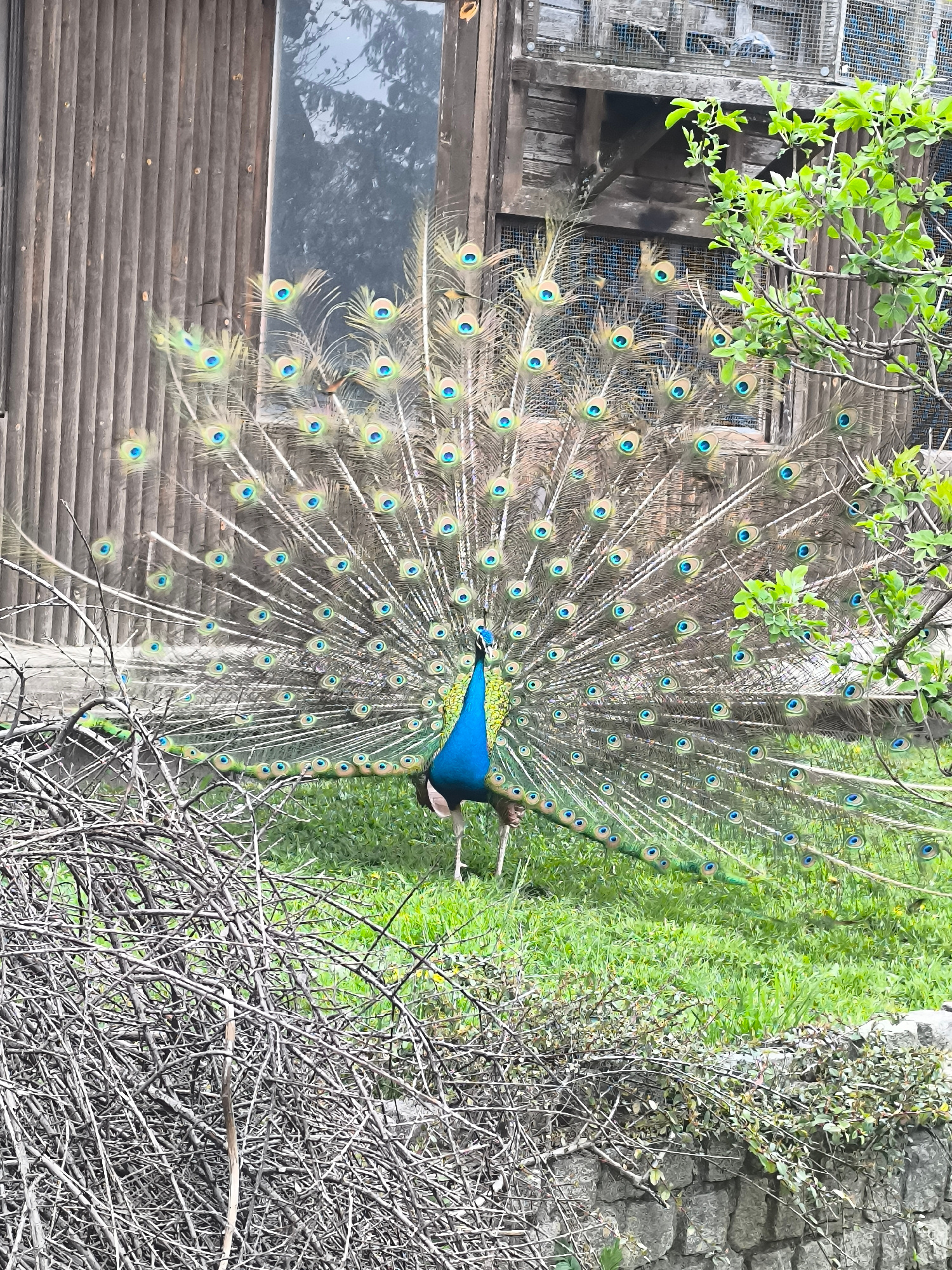 A peacock is displaying its feathers in front of a wooden building, possibly an enclosure, in a grassy area. Some bare branches are on the left side of the image, and some green leaves are on the righβ¦read more