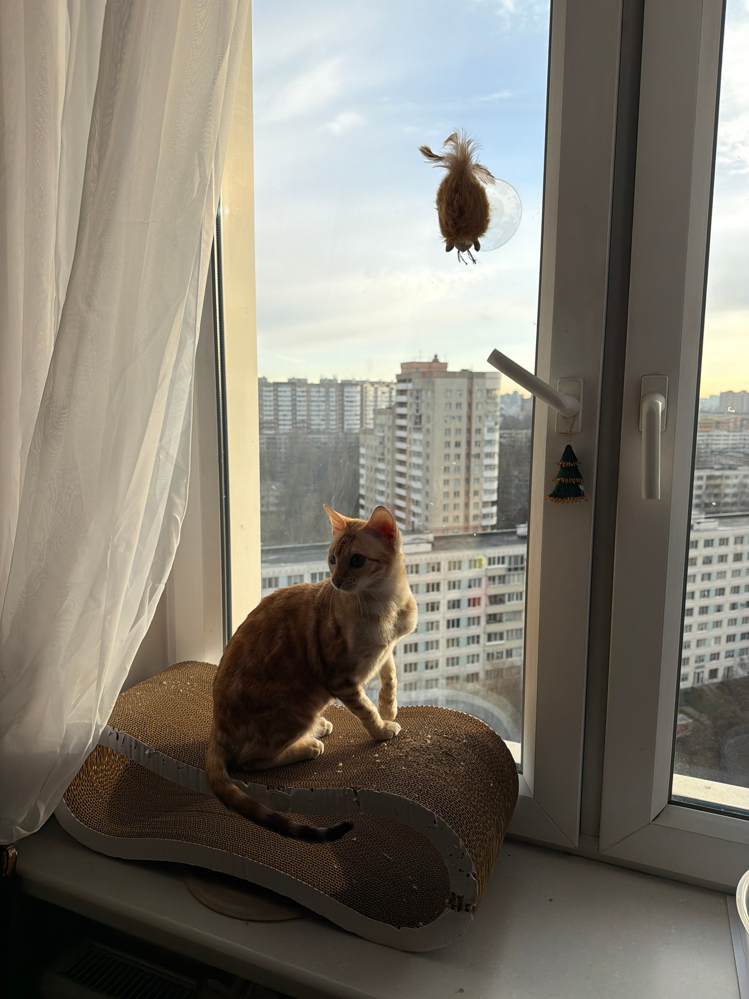 A ginger cat is on a scratching board near a window in Vsevolozhsk, Russia. A cat toy with a suction cup is attached to the window above the cat. A miniature Christmas tree ornament is attached to the…read more