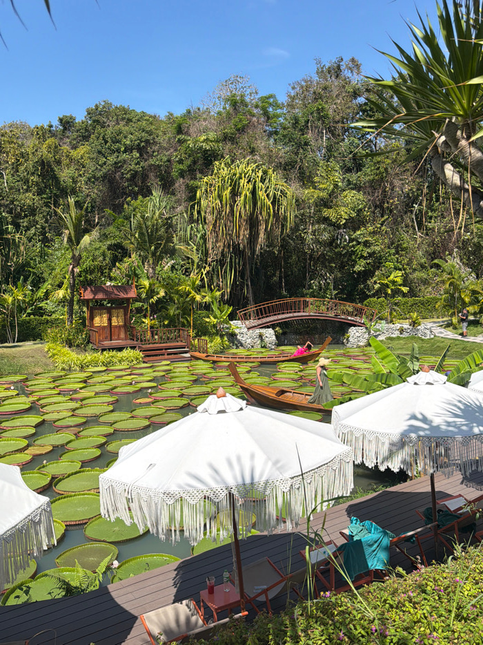 This image presents a serene and vibrant tropical garden scene, likely situated in Ban Khlong Khian, Thailand. The central feature is a large body of water extensively covered with numerous giant, cir…read more