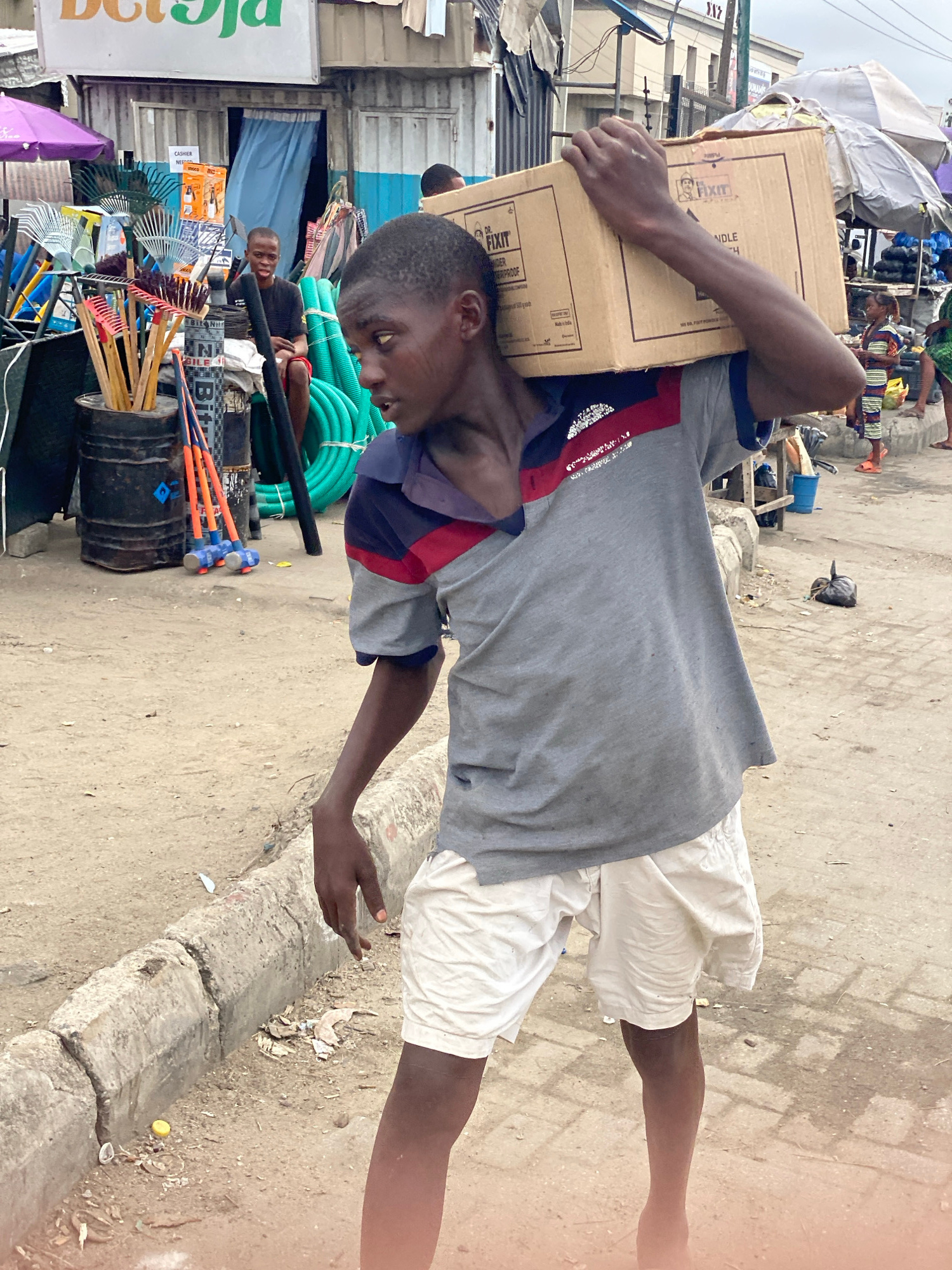 The image depicts a young man in Lekki, Nigeria, carrying a cardboard box on his head. He wears a gray t-shirt with red and blue accents, and white shorts. He is walking on a concrete road with a side…read more