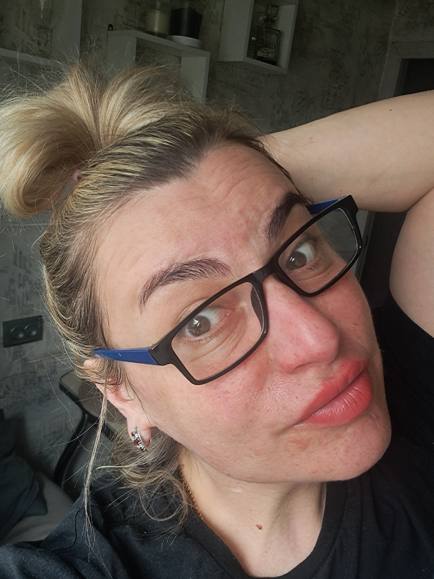 A close-up indoor selfie depicts an adult female subject in Elektrostal, Russia. The subject has light brown and blonde hair styled in a messy bun, with visible darker roots. She wears black-framed gl…read more