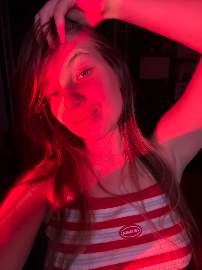 A young adult female is depicted in a medium close-up, illuminated by strong red light within an otherwise dark, indistinct indoor environment, located in the city of Vozdovac Urban Municipality, Serbβ¦read more