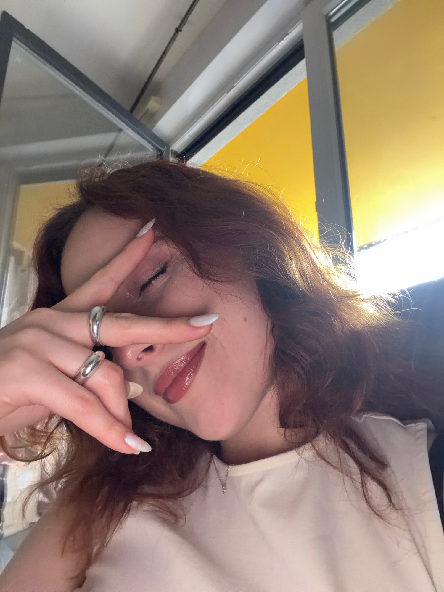 A woman with long, auburn hair and wearing a white shirt is positioned with her face near a window in Strasbourg, France. She is holding her hand up, displaying two silver rings on her fingers, while…read more
