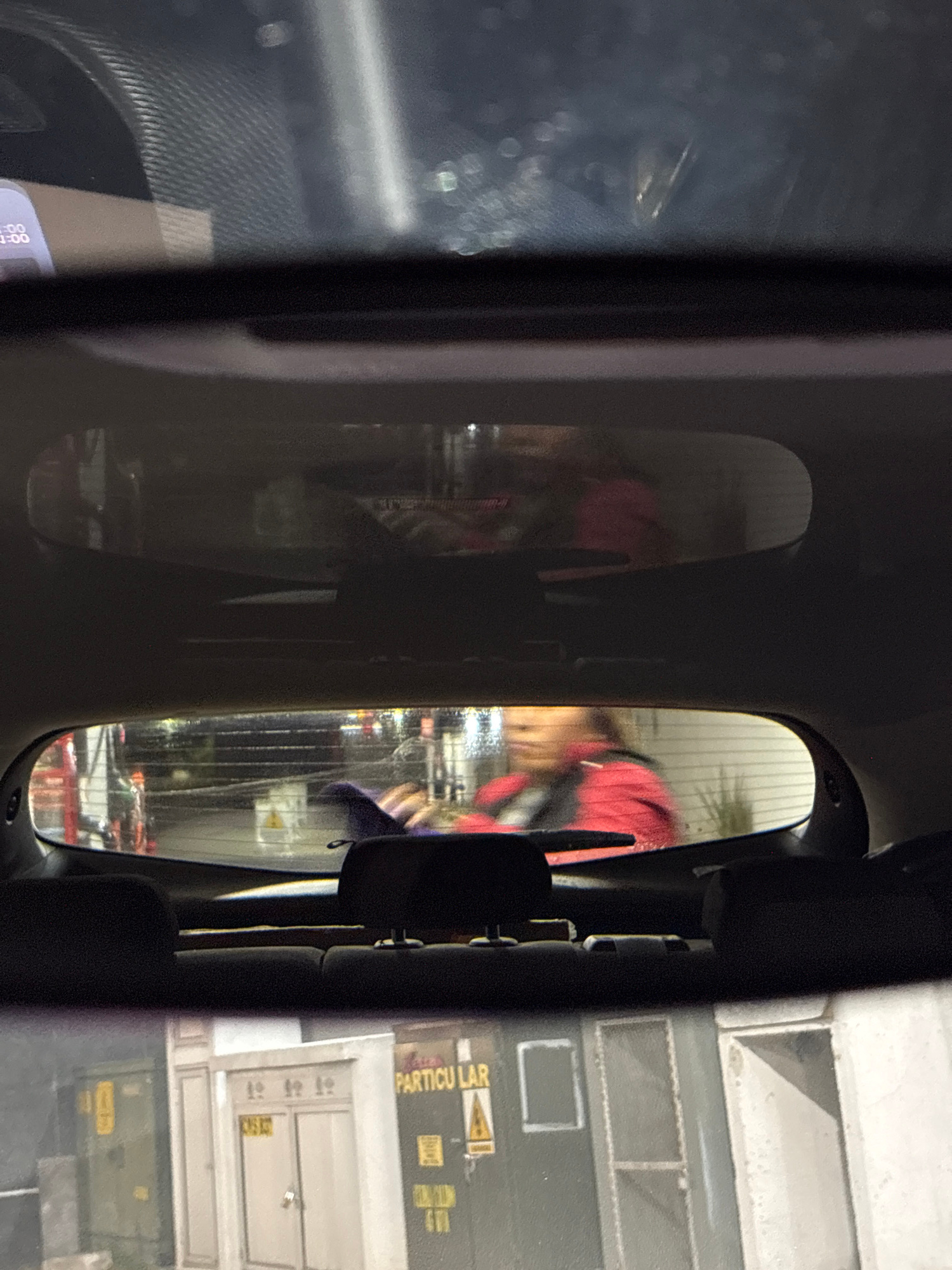 The image shows a view through a vehicle's side mirror. In the reflection, a person wearing a red and black jacket appears to be interacting with a shopping cart. The background shows a store with she…read more