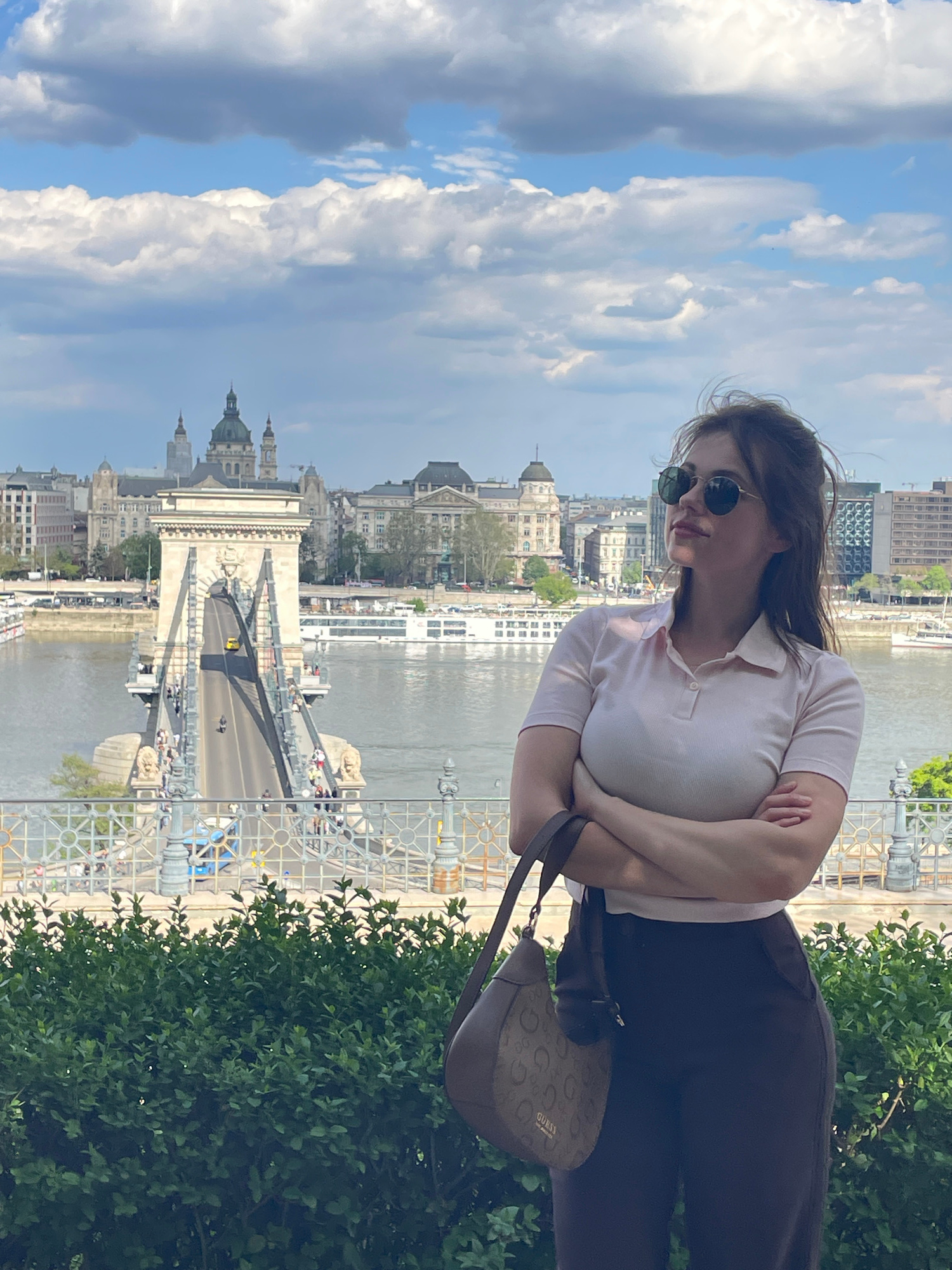A young woman is prominently featured on the right side of the image, facing slightly left. She has dark hair, is wearing dark sunglasses, and a light-colored, short-sleeved polo shirt. Her arms are c…read more