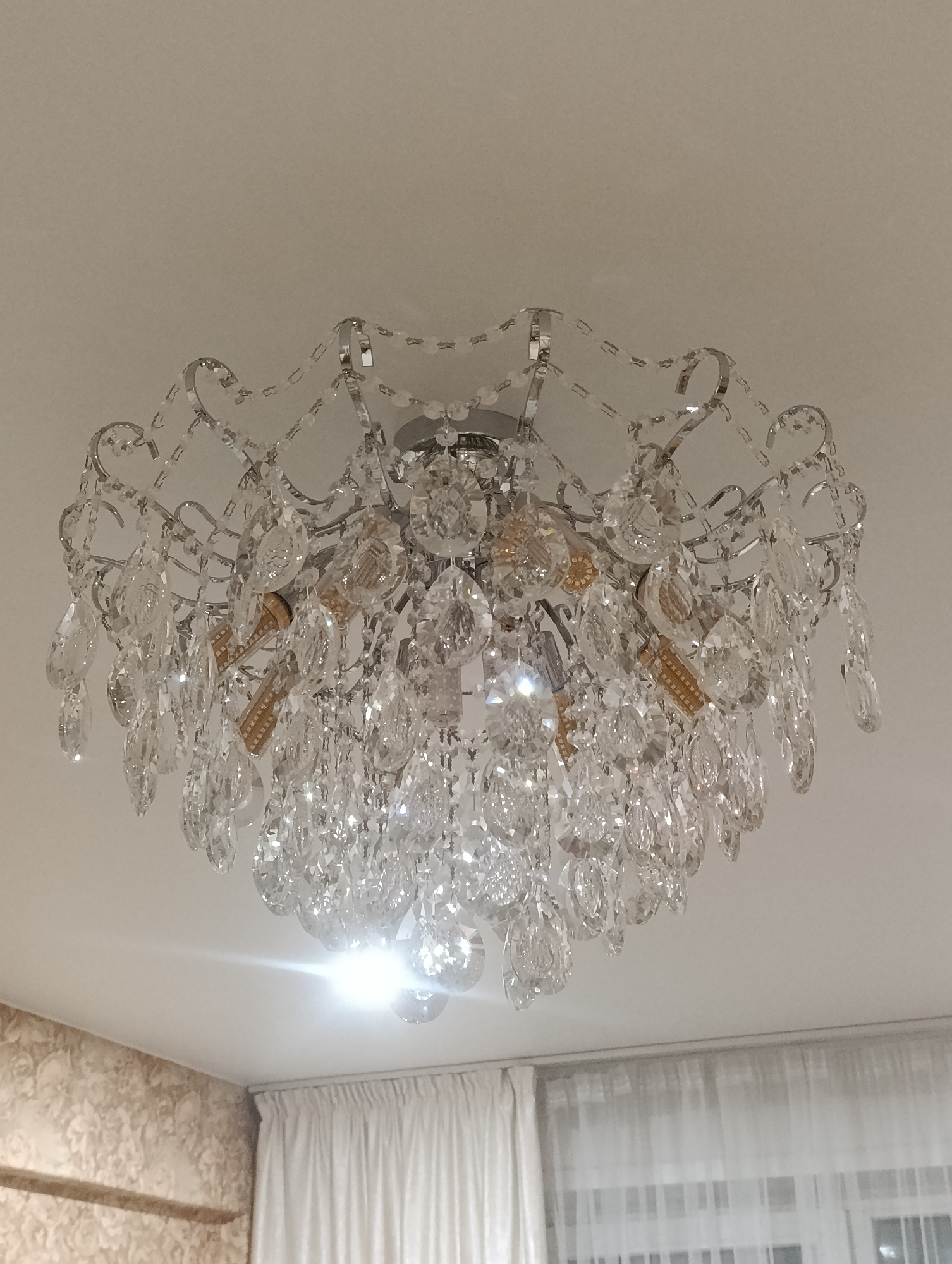 A chandelier hangs from the ceiling in a room. The chandelier is silver with clear crystals. The crystals reflect light, creating a sparkling effect. White curtains are visible in the background. A po…read more