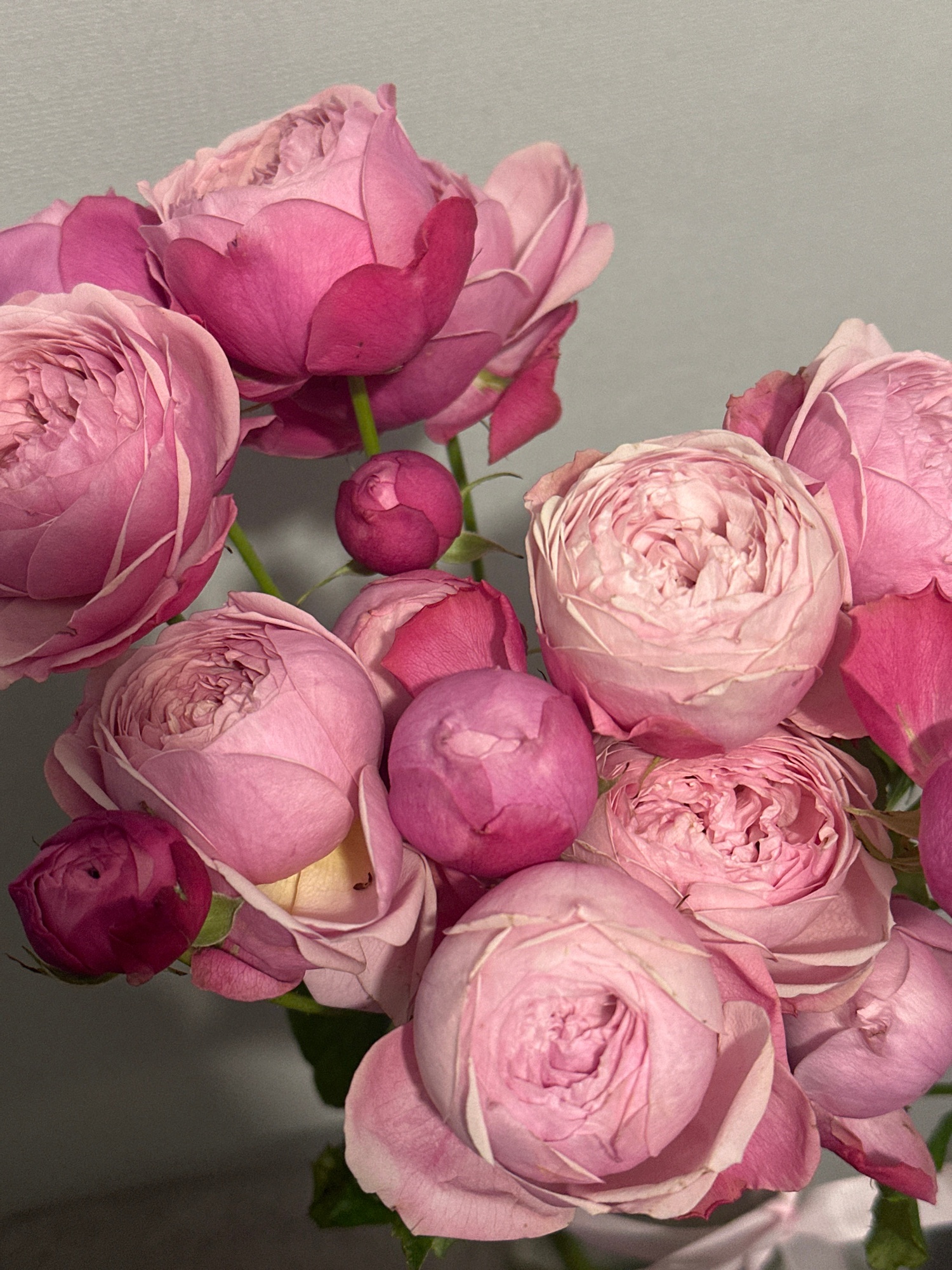 The image shows a close-up of a bouquet of pink roses. The roses are in various stages of bloom, from tight buds to fully open flowers. The color ranges from light pink to a deeper magenta. The background is a plain grey surface. There are no people or indications of a specific location in Kazan, Russia. The image consists only of the roses and the background. | Open Wire