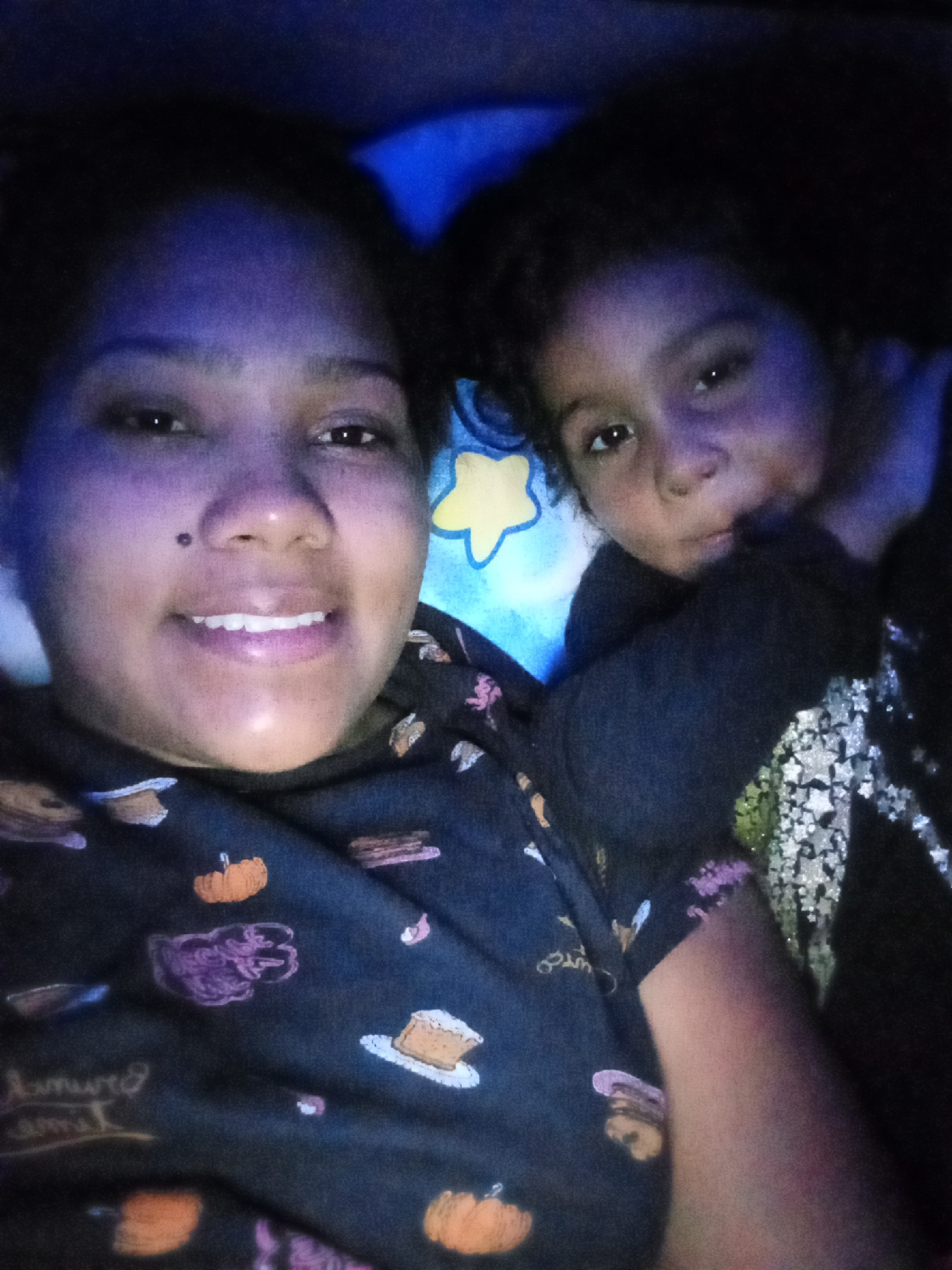 The image shows a selfie taken at night, likely indoors, with a woman and a child lying down together. The woman is smiling, facing the camera directly. She has dark hair and a mole near her nose. Her…read more
