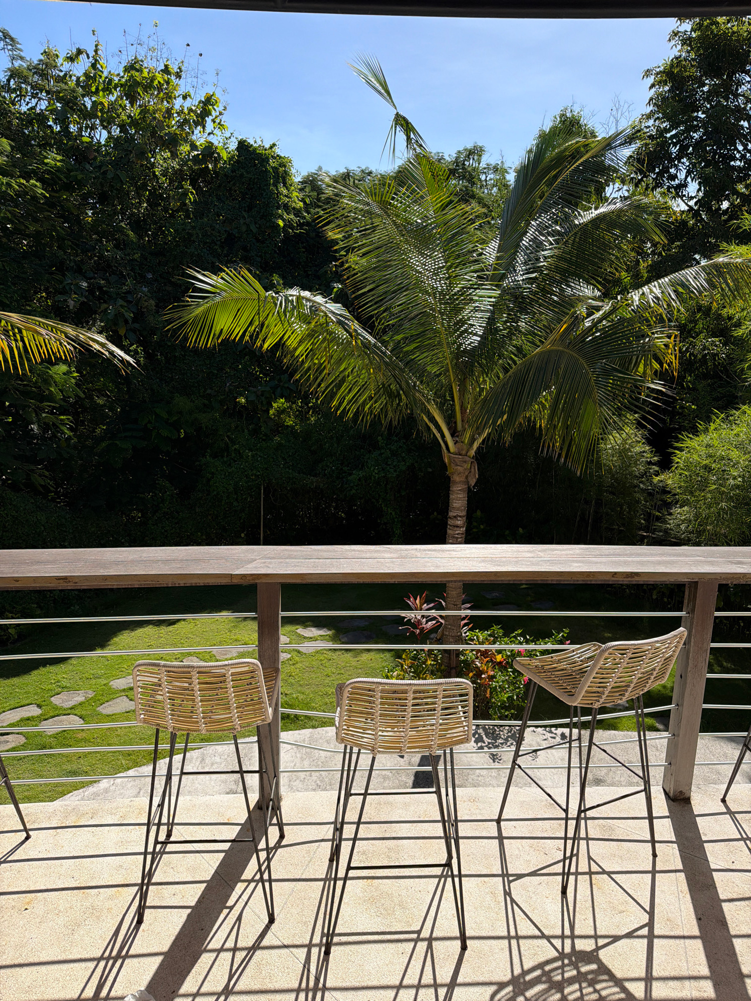The photograph shows a view from a balcony, likely located in Uluwatu, Indonesia. On the left side, there is a tall palm tree with its fronds extending into the clear blue sky. Lush green vegetation a…read more