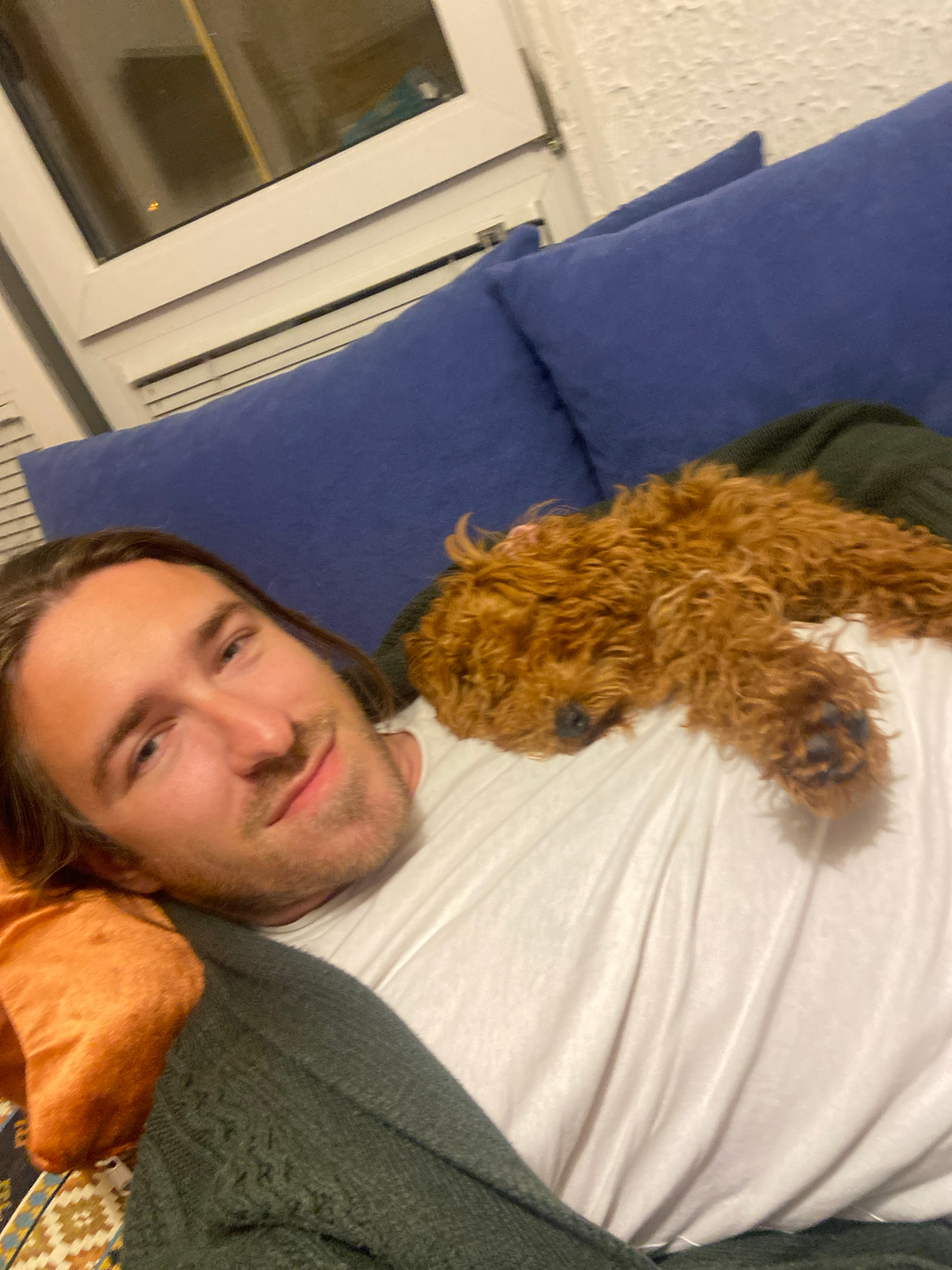 A man lies on a bed with a dog. The man has brown hair, light skin, and a beard. He is wearing a dark green sweater and has a pillow with an orange cover under his arm. The dog is lying on the man's chest. The dog has a curly, brown coat. The bed has a white sheet and a blue pillow. A window is visible in the background, suggesting an indoor setting. Based on the lighting in the window, it is likely nighttime. It is not possible to verify the location as Sutomore, Montenegro based on the provided image. | Open Wire
