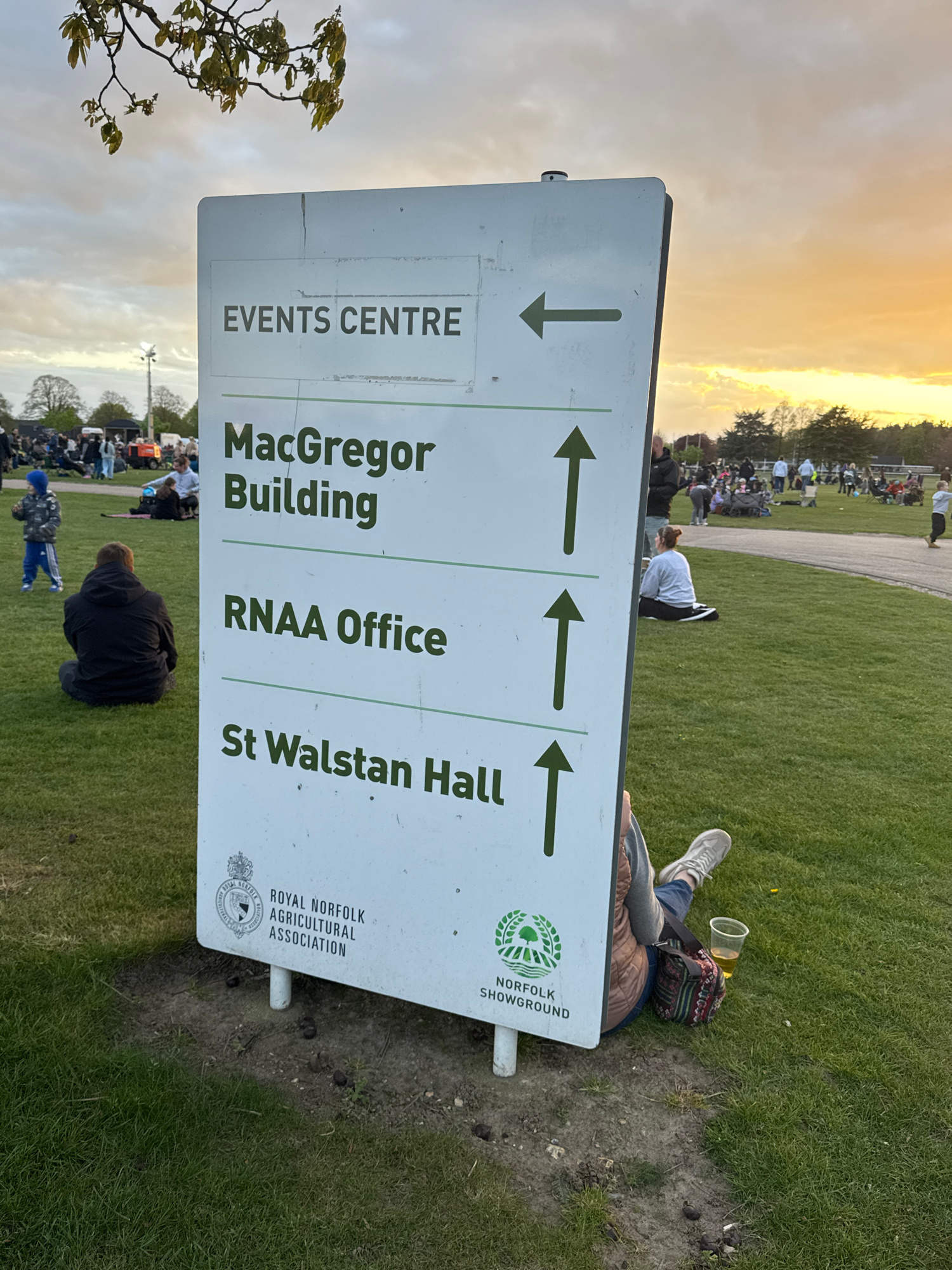 The image captures a scene outdoors, likely during an event at the Royal Norfolk Showground, South Norfolk, United Kingdom. The foreground is dominated by a signpost indicating directions to the Event…read more