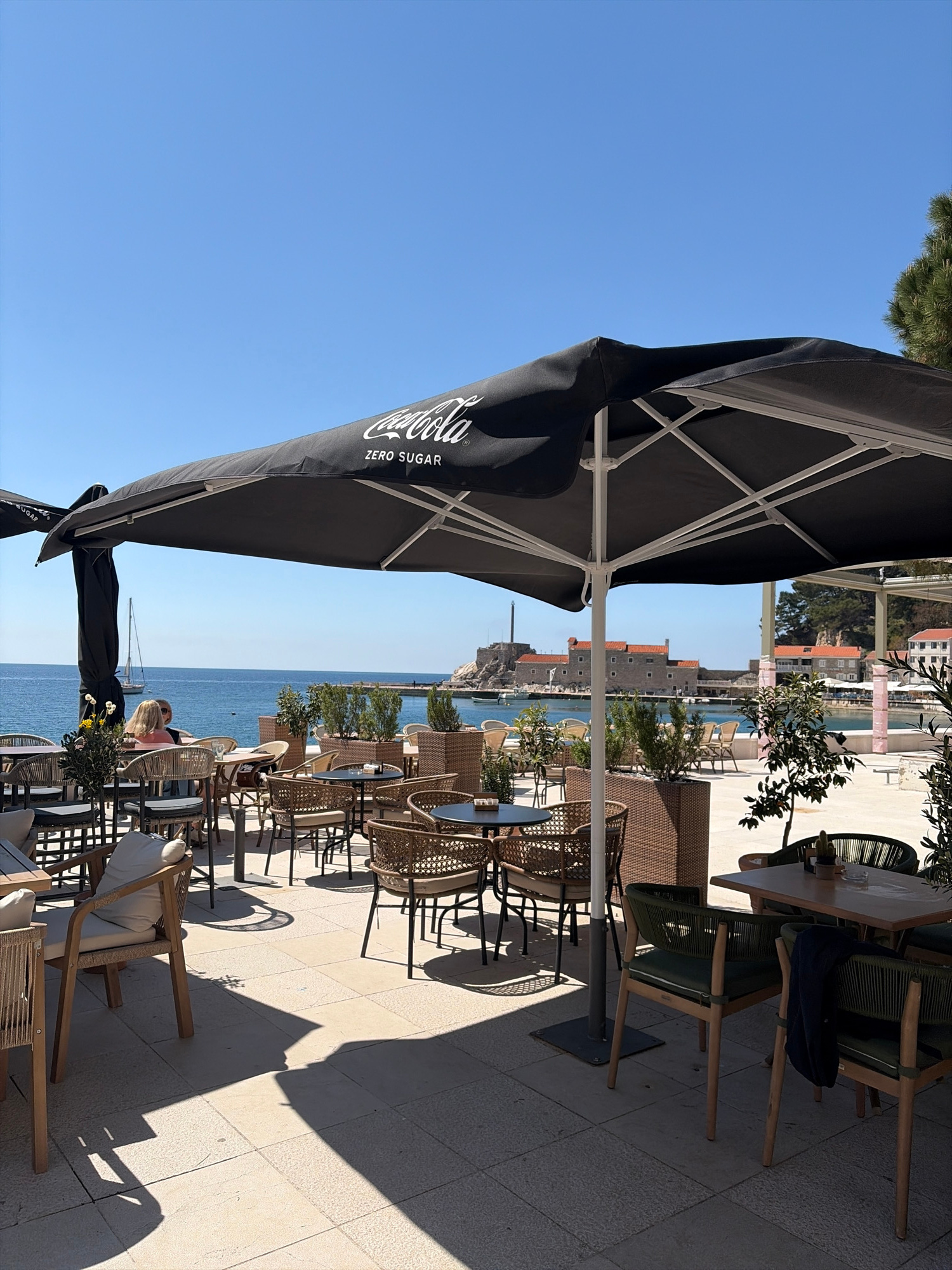 The image shows an outdoor cafe setting on a sunny day in what appears to be a coastal city. **Location:** Unknown, Unknown **Environment:** The foreground is dominated by outdoor cafe furniture – t…read more