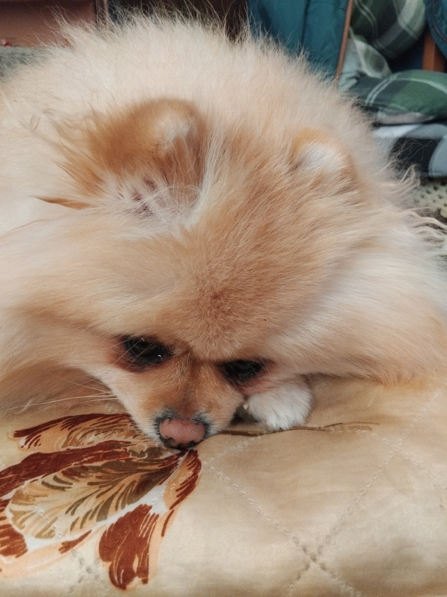 A close-up shot captures a fluffy, light cream-colored dog, likely a Pomeranian, resting indoors. The dog's head is turned towards the right, with its dark eyes partially visible and a pinkish-brown nā¦read more