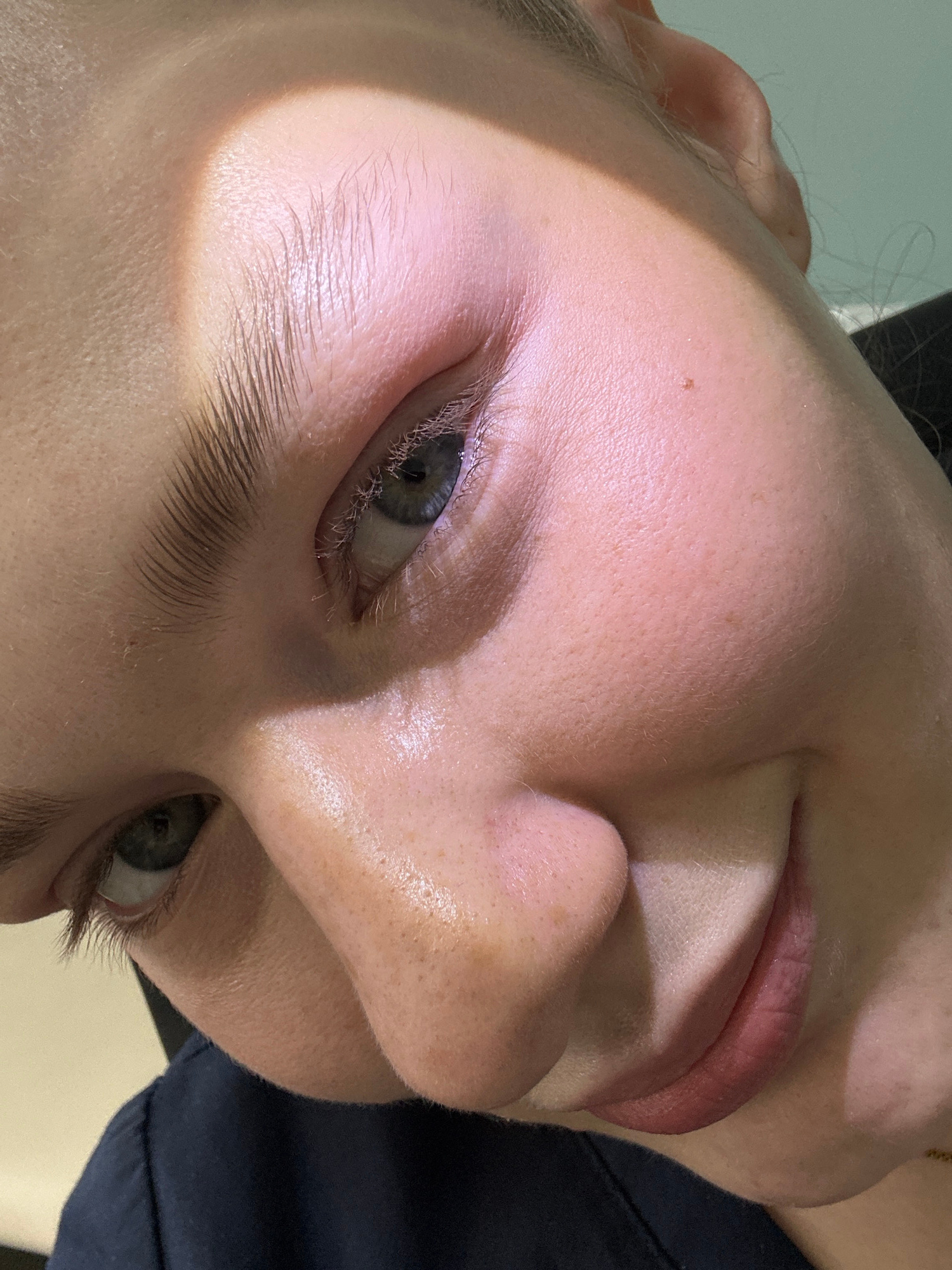 Close-up, tilted view of a Caucasian person's face. The person has fair skin, grey eyes, and thick eyebrows. Some facial pores and skin texture are visible. The lips are pink and slightly parted. A mo…read more