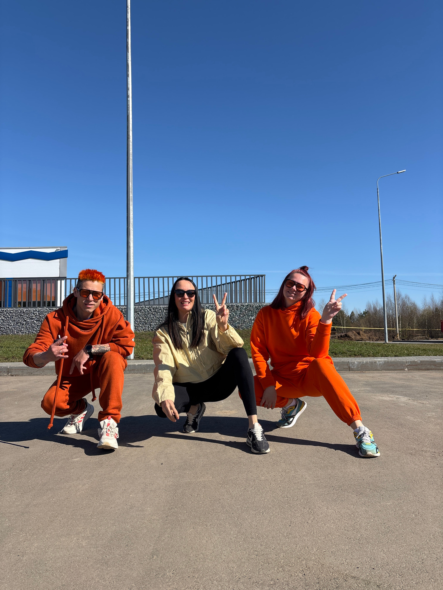 Three individuals pose in an outdoor setting in Votkinsk, Russia. The location appears to be a paved area near a fence and a building with blue and white accents. The sky is clear and blue. The indivi…read more