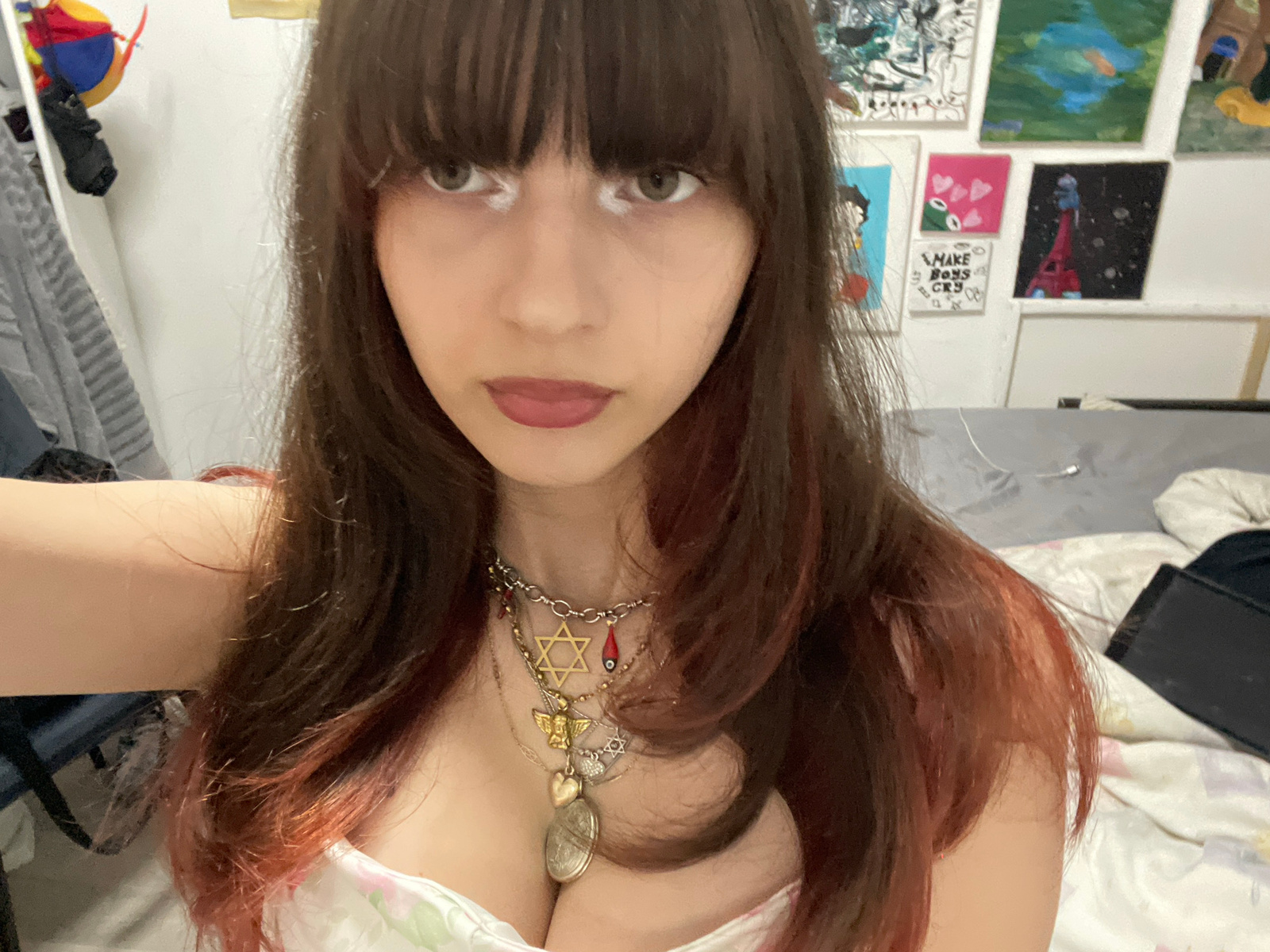 The image shows a person with brown hair and bangs, wearing a necklace with multiple pendants including a Star of David, upside down. The background includes a bed, artwork on the wall, and a closet.…read more