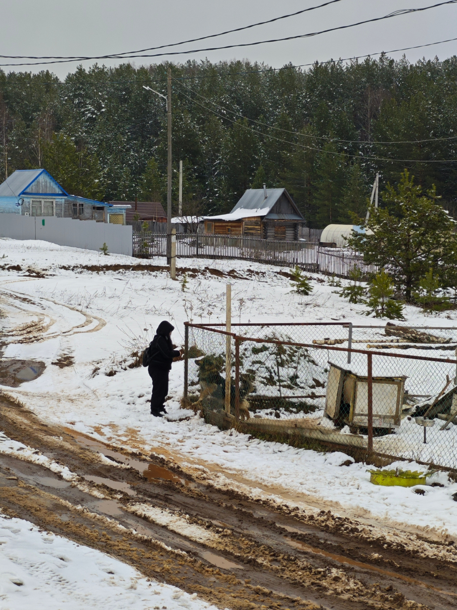The image captures a winter scene, presumably in a rural area, possibly near Markovo, Russia. A person dressed in black stands near a dilapidated fence, seemingly interacting with something inside the…read more