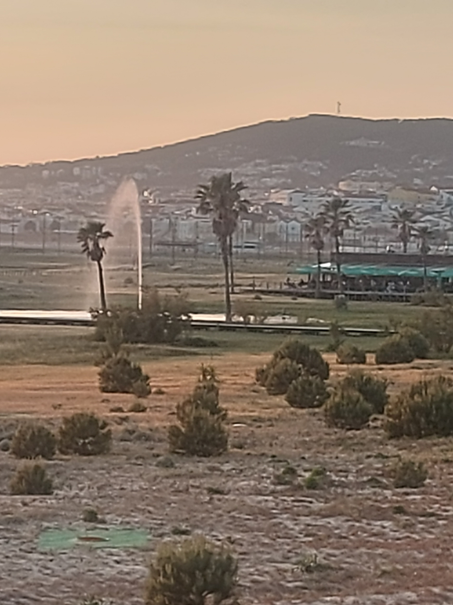 The image depicts a cityscape in Figueira da Foz, Portugal, with a mountain in the background and a row of palm trees alongside a green area featuring sprinkler systems. The lighting suggests either s…read more