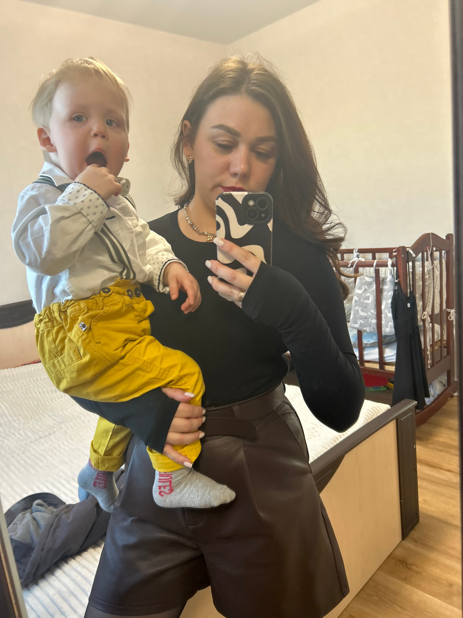 A woman is taking a selfie in a mirror while holding a baby. The woman has long brown hair and is wearing a black long-sleeved shirt, a silver necklace, and brown leather pants. She is holding a smart…read more
