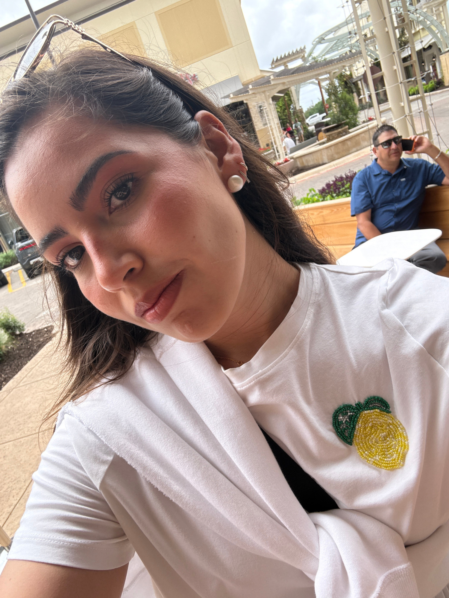The image shows a woman in a white t-shirt with a beaded lemon pin on the front. She is wearing pearl earrings and glasses are tucked into her hair. In the background, a man wearing a blue shirt and s…read more