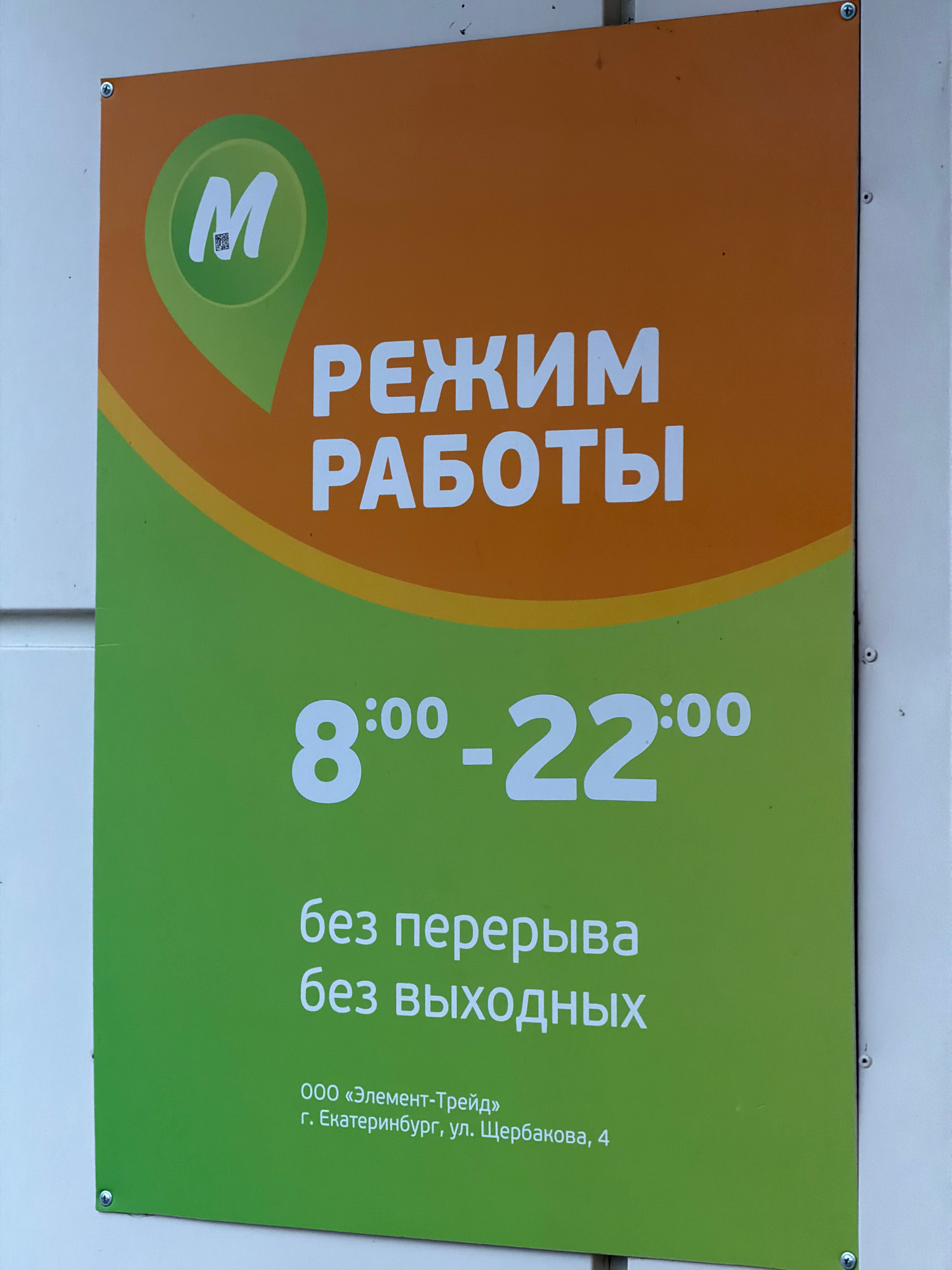 The image shows a sign with the opening hours of a business located in Yekaterinburg, Russia. The sign is predominantly orange and green and reads "Режим работы" (opening hours) and "8:00-22:00" (8 AM…read more