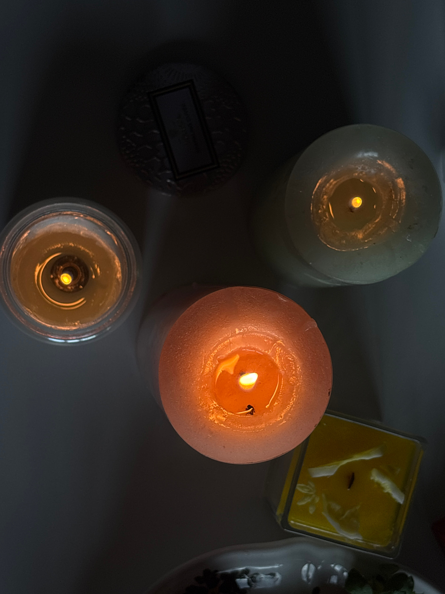 The image shows a dimly lit tabletop scene with four lit candles of varying shapes and colors. One candle is tall and orange, another is wide and light green, a third is a yellow square candle in a gl…read more