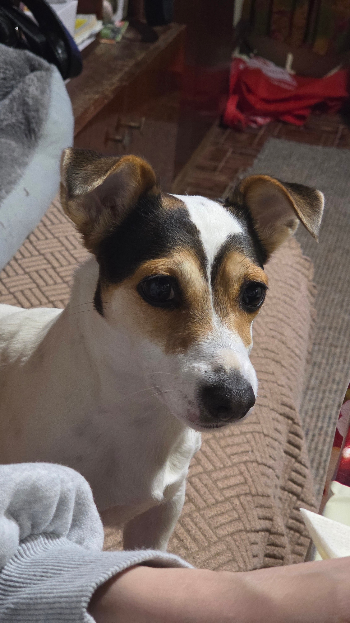 A medium shot captures a Jack Russell Terrier dog with its head tilted upward, positioned near a person wearing a light gray sweater. The dog has a distinctive tri-color pattern on its head, featuring…read more