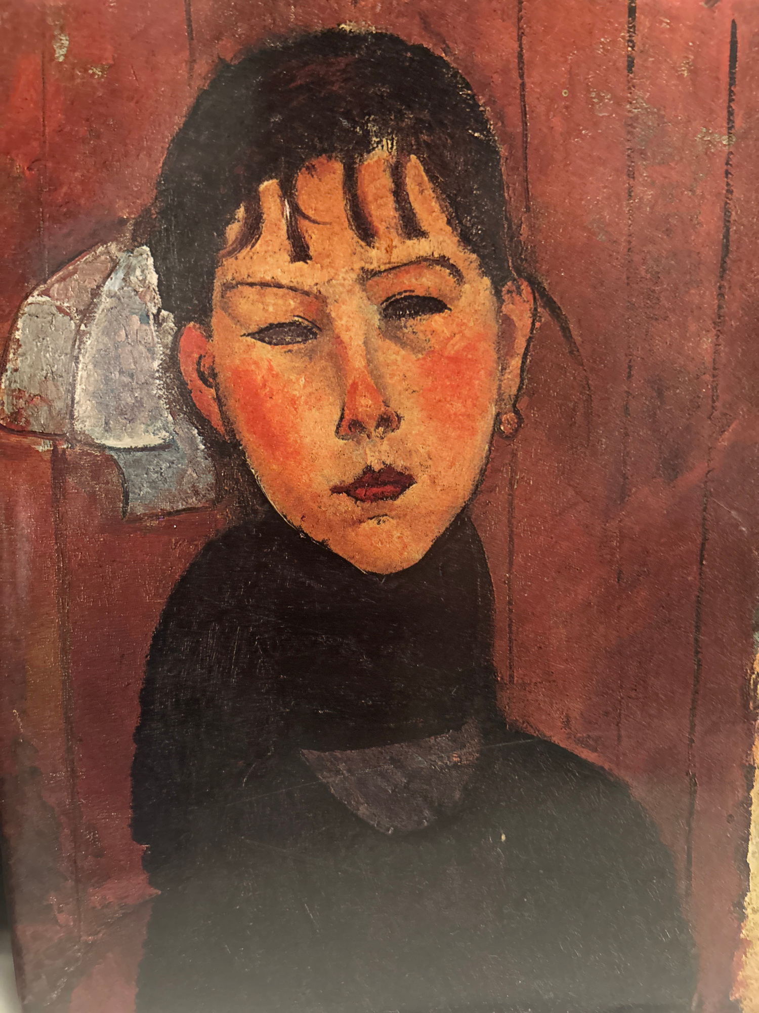 A painting shows a portrait of a reclining woman. She is fair-skinned with rosy cheeks and black hair. She is lying on a red surface, perhaps a bed or floor. The location of Pantin, France, is not vis…read more