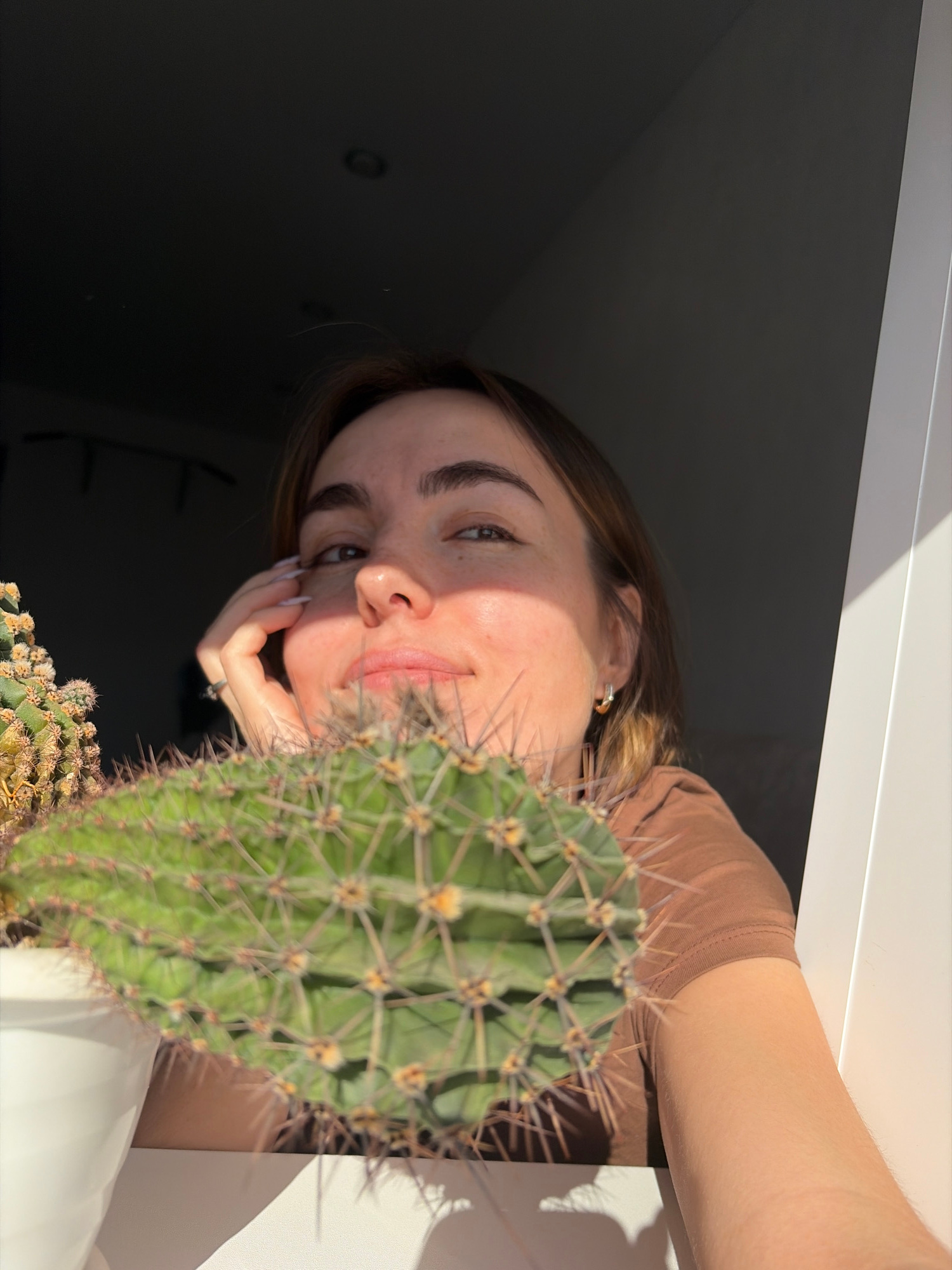 A young woman is posing next to a cactus plant in a white pot. She is wearing a brown shirt and gold earrings. Her right hand is resting on her face, her nails are painted white. She is indoors next t…read more