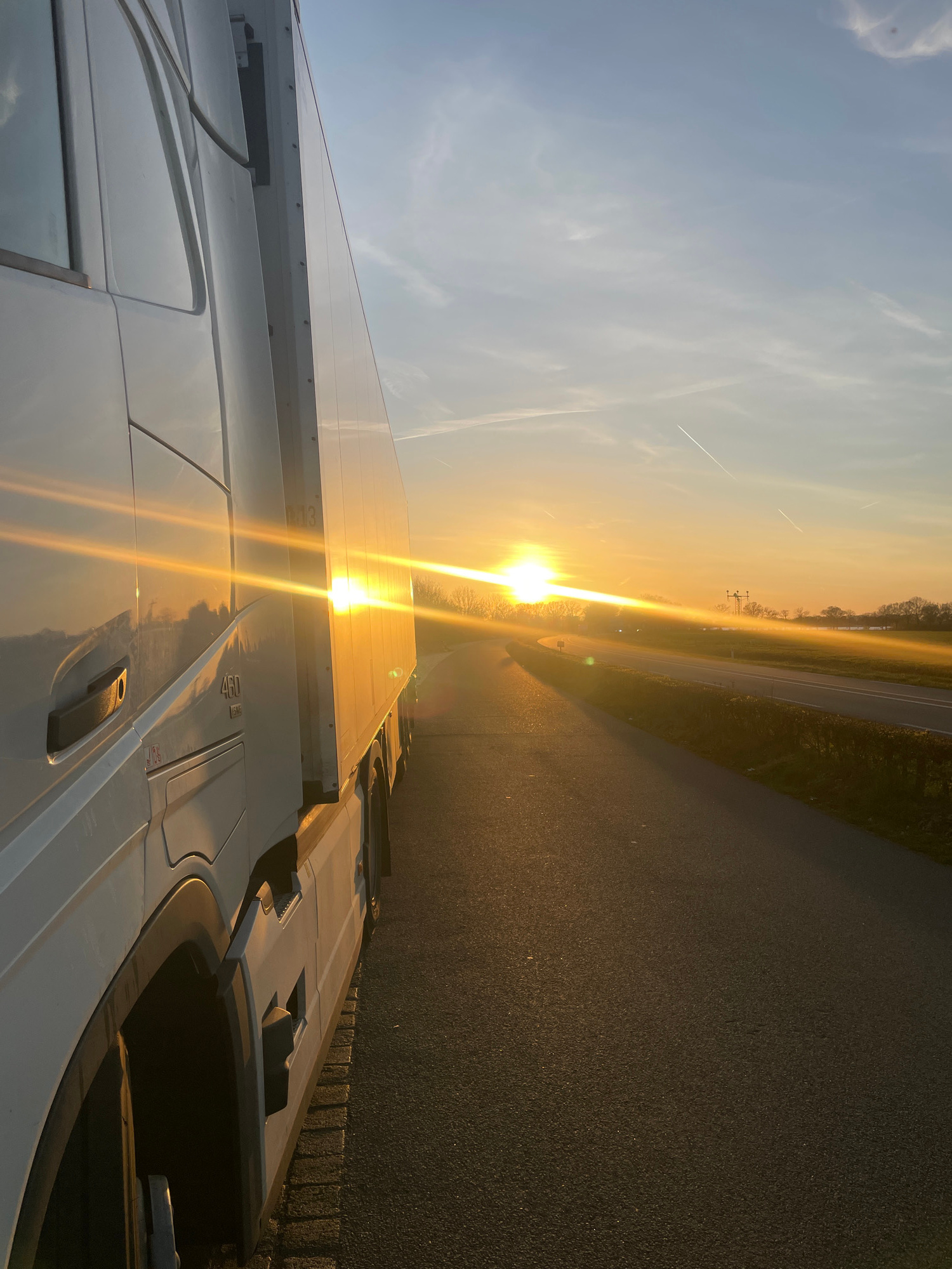 The image shows a sunlit scene in Volkel, Netherlands, featuring a truck parked on the roadside. The sun is low on the horizon, casting a bright glare. A road and a grassy area are visible beyond the…read more