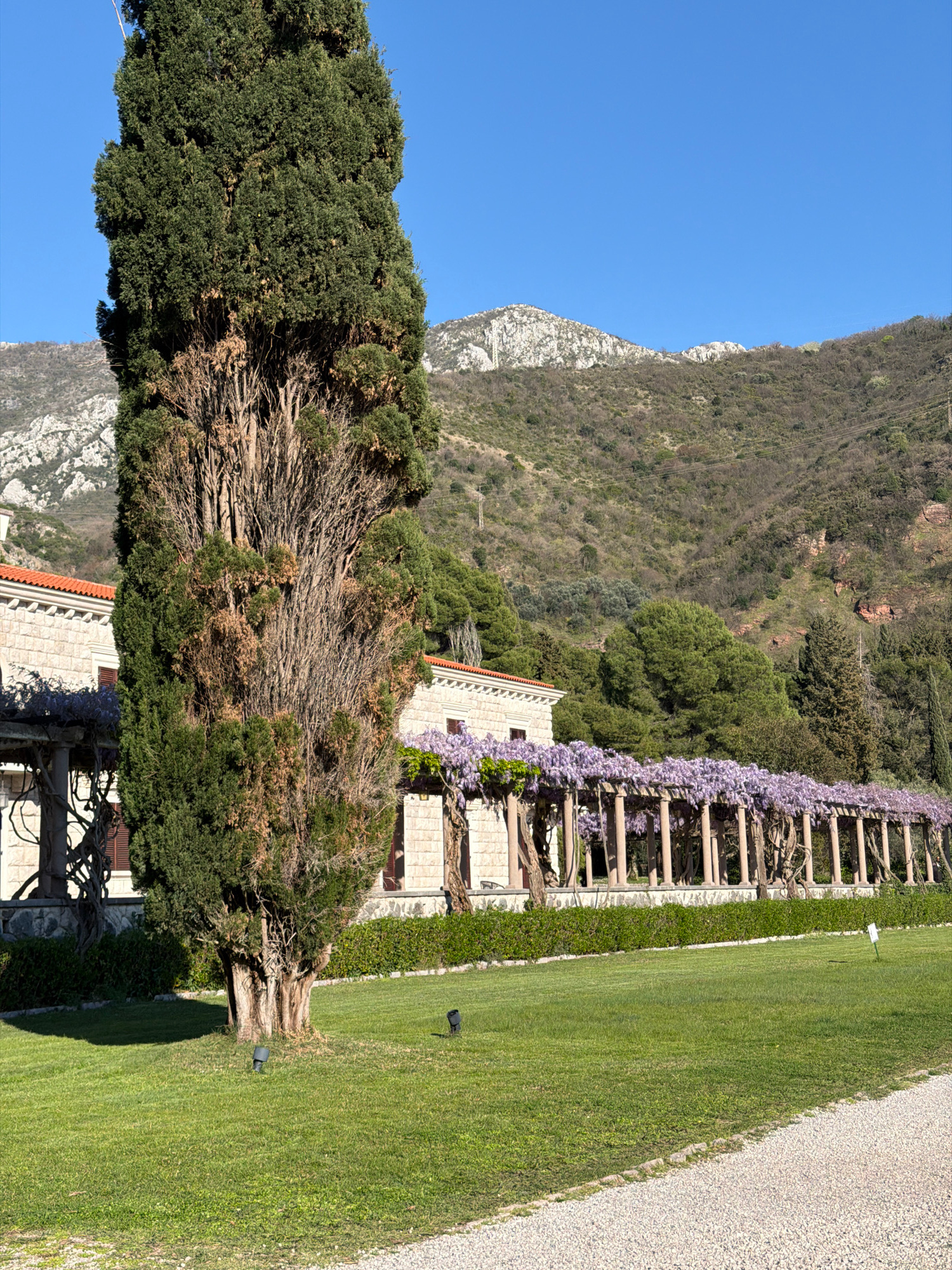 The image shows a landscape near Sveti Stefan, Montenegro, with a combination of natural and architectural elements. In the foreground is a tall tree with dense green foliage, with some sections exhib…read more