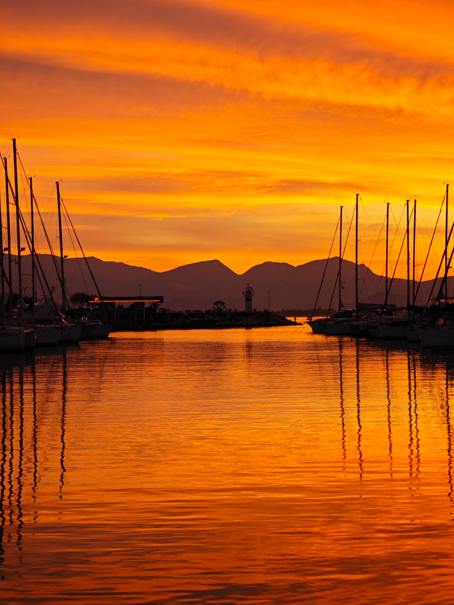 The image captures a vivid sunset over a harbor in Finike, Turkey. Silhouetted mountains form the backdrop to a marina filled with sailboats. A lighthouse is visible on a breakwater between the boats.…read more