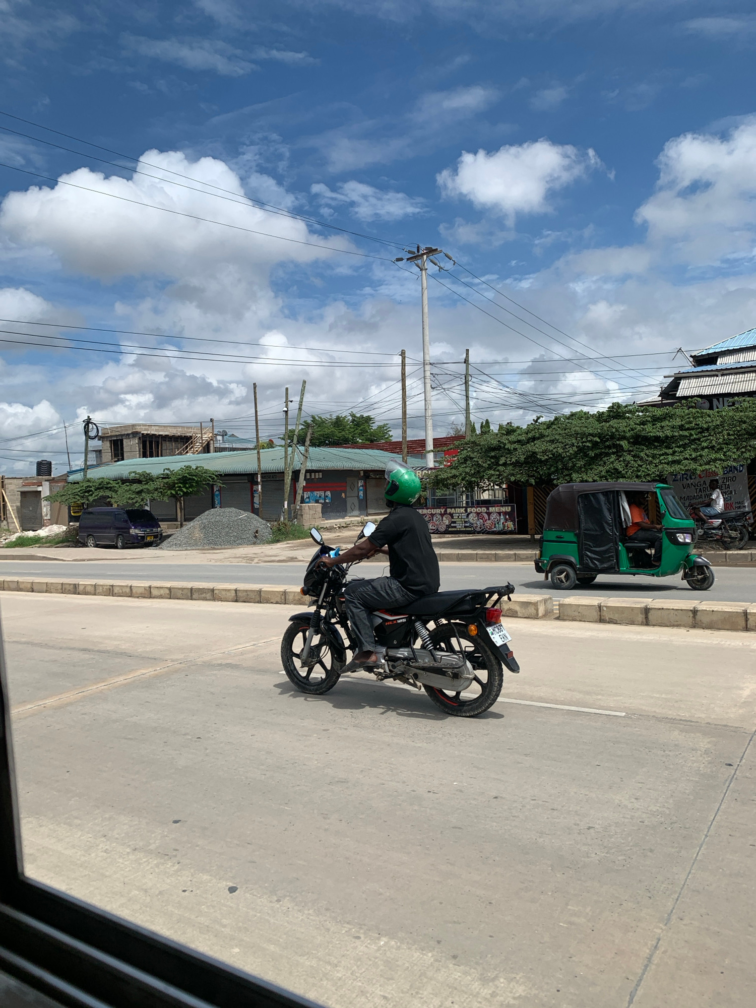 A medium-shot, sideways-oriented, eye-level photograph captures a street scene in Dar es-Salaam, Tanzania, during daylight. A person with a green helmet is on a black motorcycle. The street is paved w…read more