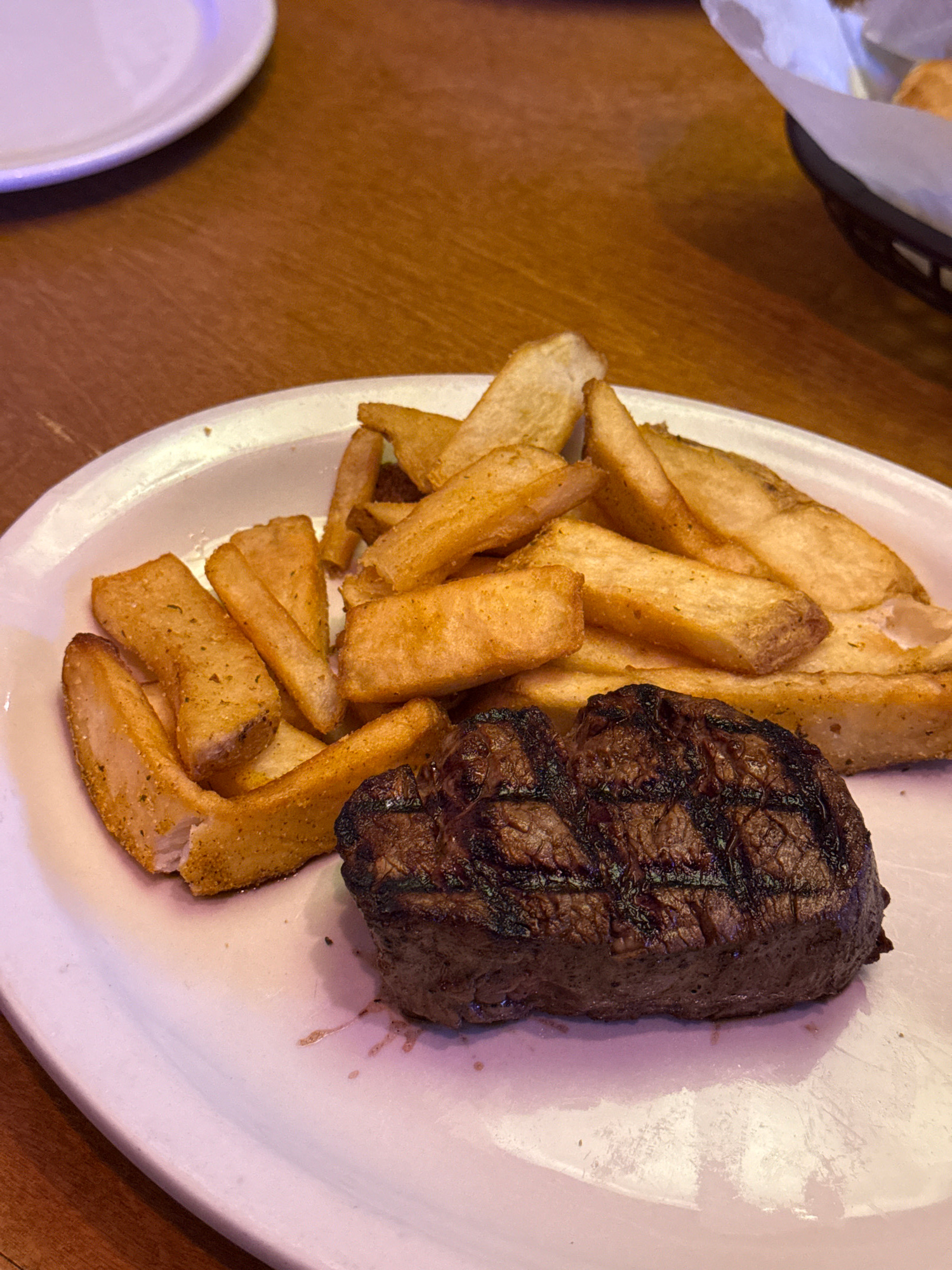 The image shows a plate of food. On the plate are french fries and a piece of grilled meat, likely steak. The plate sits on a wooden table. Part of another plate and a basket lined with paper are also…read more