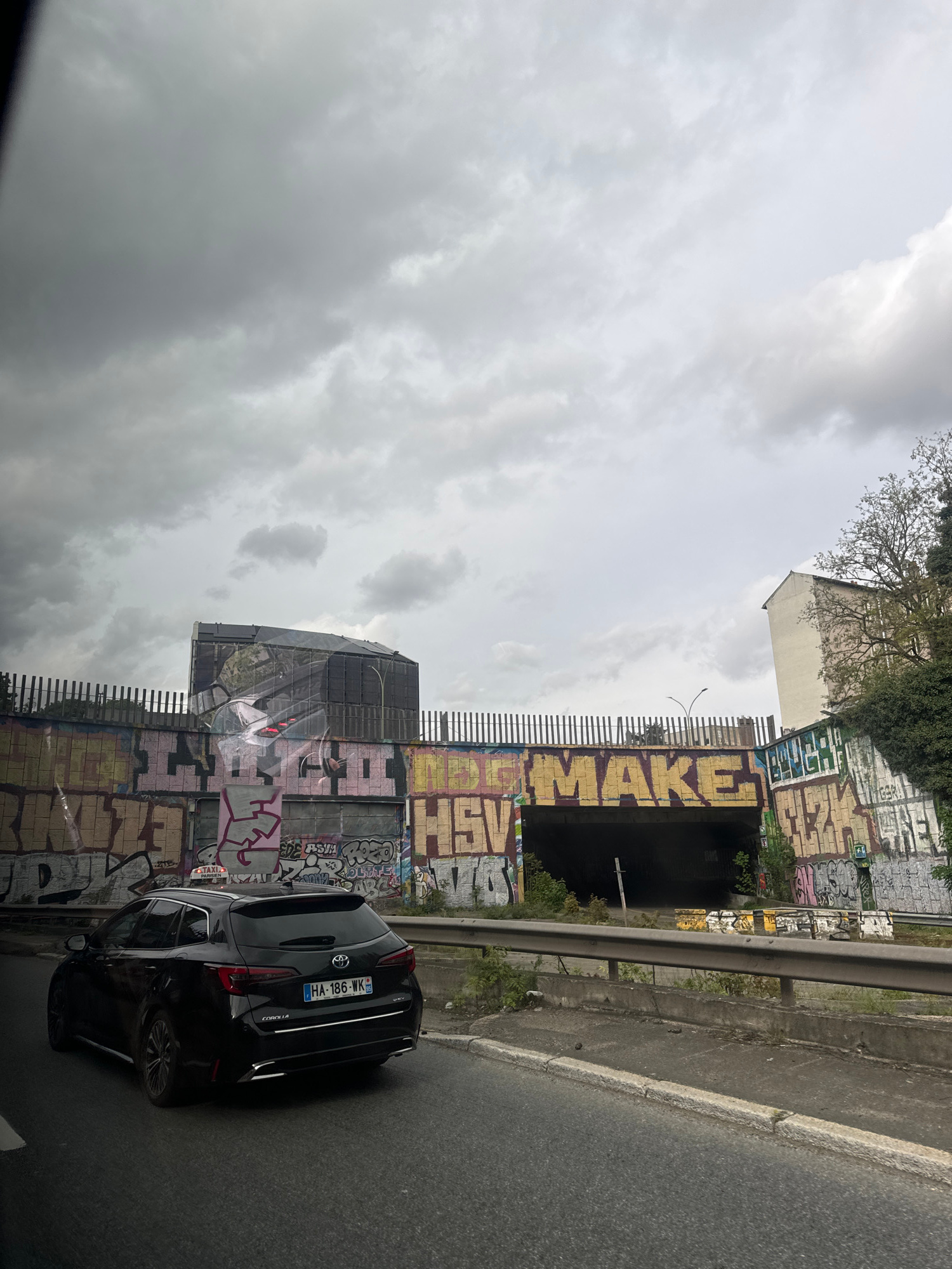The image shows a black Toyota Corolla car with the license plate HA-186-WK, parked on a road in Gentilly, France. The road appears to be next to a graffiti-covered concrete structure with a tunnel ru…read more