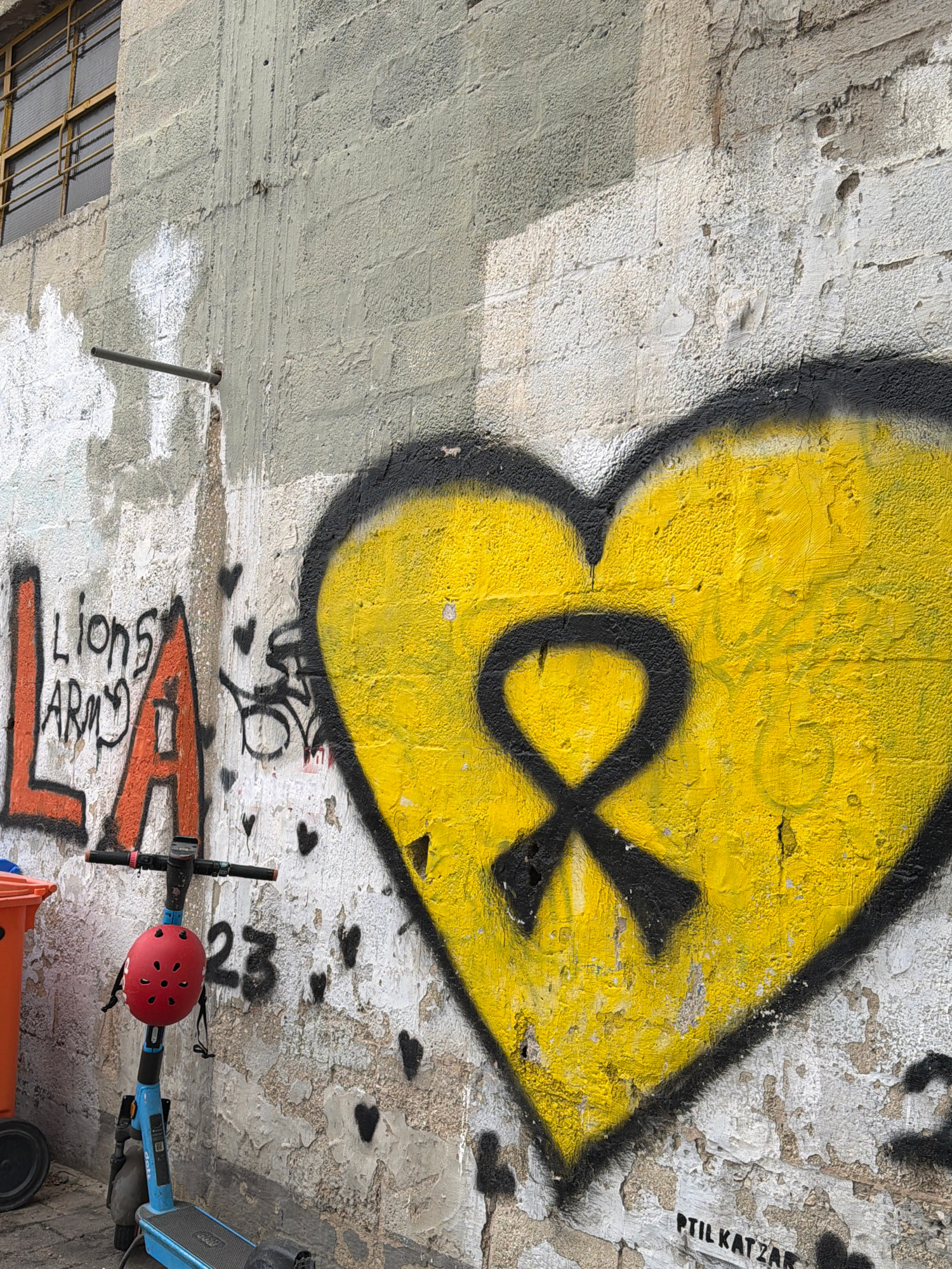 The image depicts a segment of a wall in an urban environment, possibly located in Tel-Aviv, Israel. The wall is covered with graffiti, including a large yellow heart with a black outline and an infin…read more