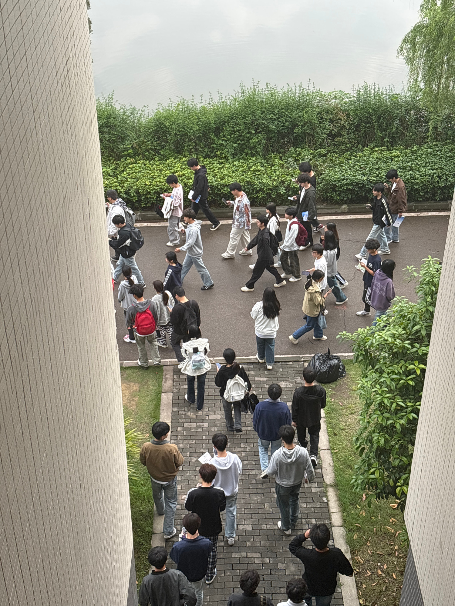 The image depicts a group of approximately 25 people walking on a paved path adjacent to a building and a green space. The path is lined with green bushes. Some individuals are carrying bags or papers…read more