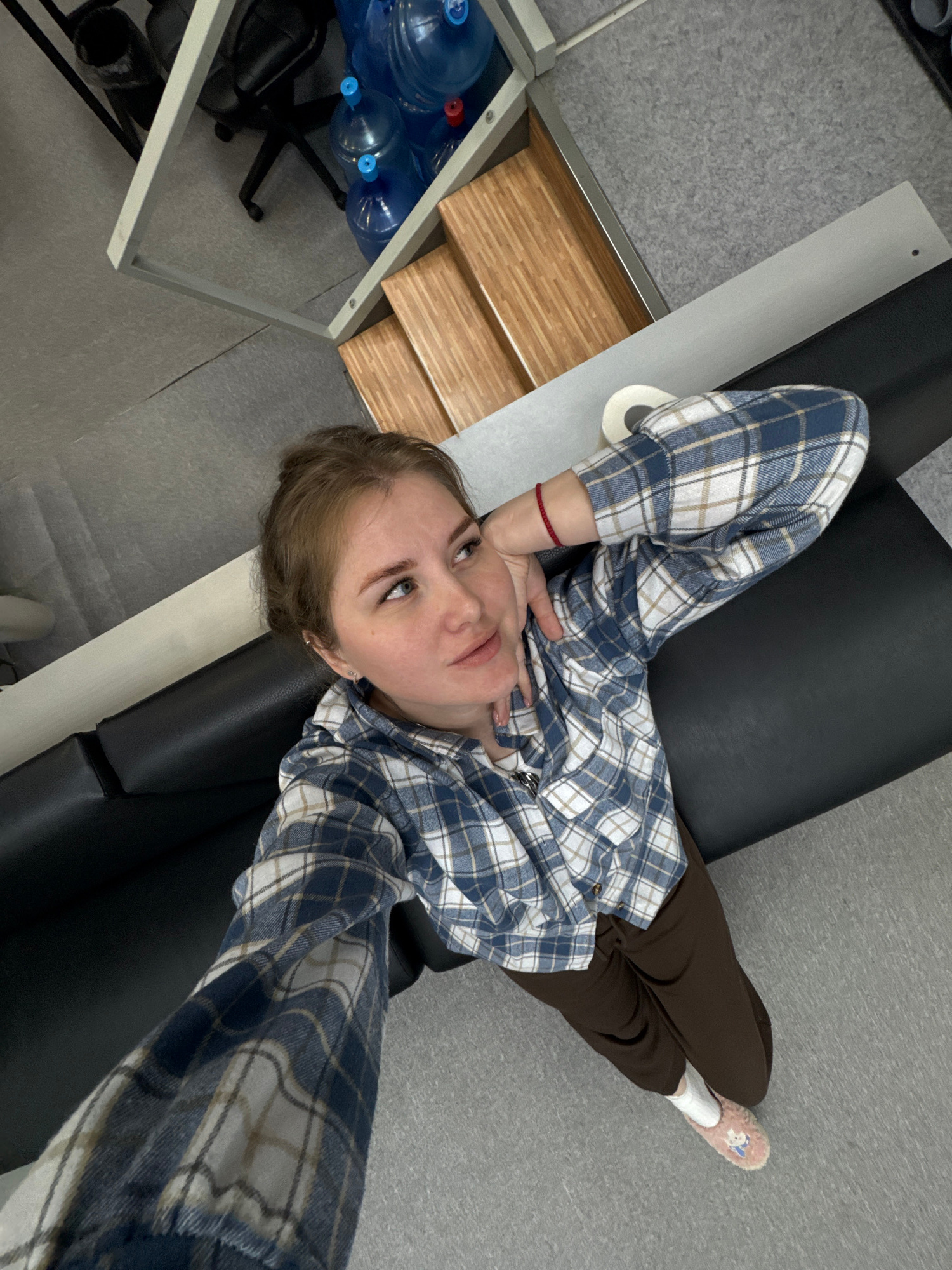A young woman is lying on a black medical examination table in a building in Perm, Russia. She is wearing a blue and white plaid shirt and brown pants and pink fuzzy slippers. She is wearing white soc…read more