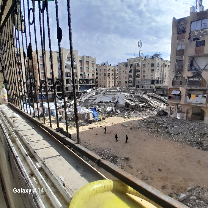 The image captures a panoramic view from a balcony overlooking a severely damaged urban landscape in Khan Yunis, Palestinian Territory, under a partially cloudy sky. In the immediate foreground, a da…read more