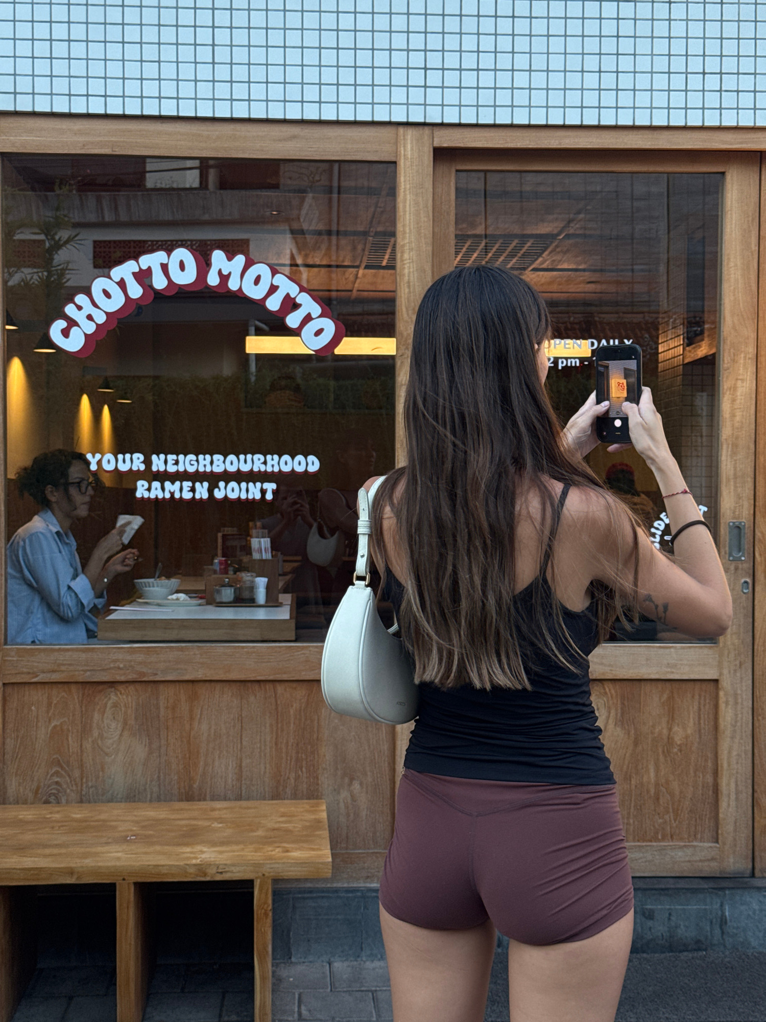 A woman is standing and taking a photo of "CHOTTO MOTTO YOUR NEIGHBOURHOOD RAMEN JOINT" restaurant signage and interior with her smartphone. The interior view shows a worker inside the restaurant. Theβ¦read more