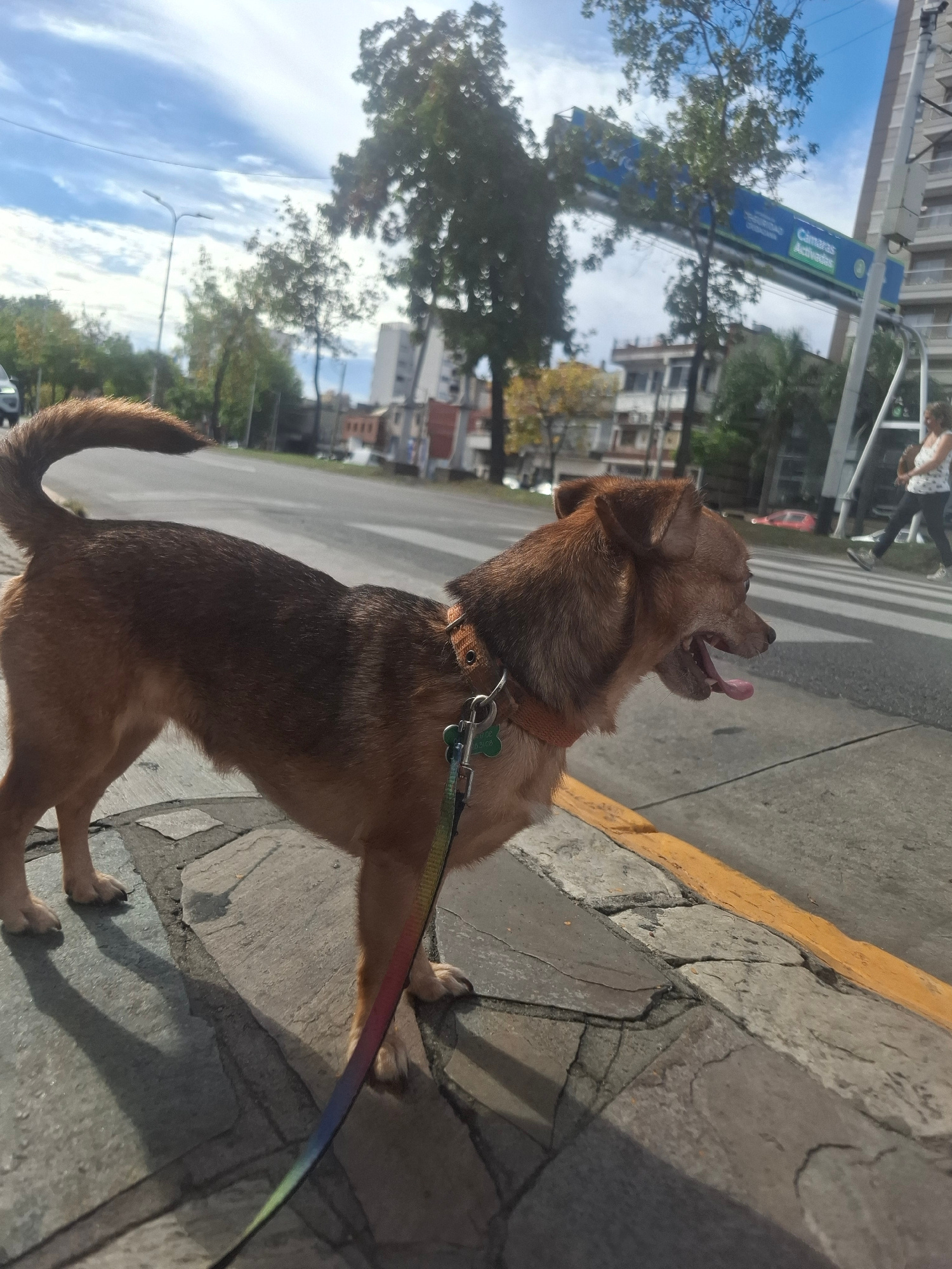 A medium-sized, brown dog with its tongue lolling out is on a leash, walking on a sidewalk bordering a street in Wilde, Argentina. The sidewalk is made of cracked stone tiles alongside a yellow painteβ¦read more