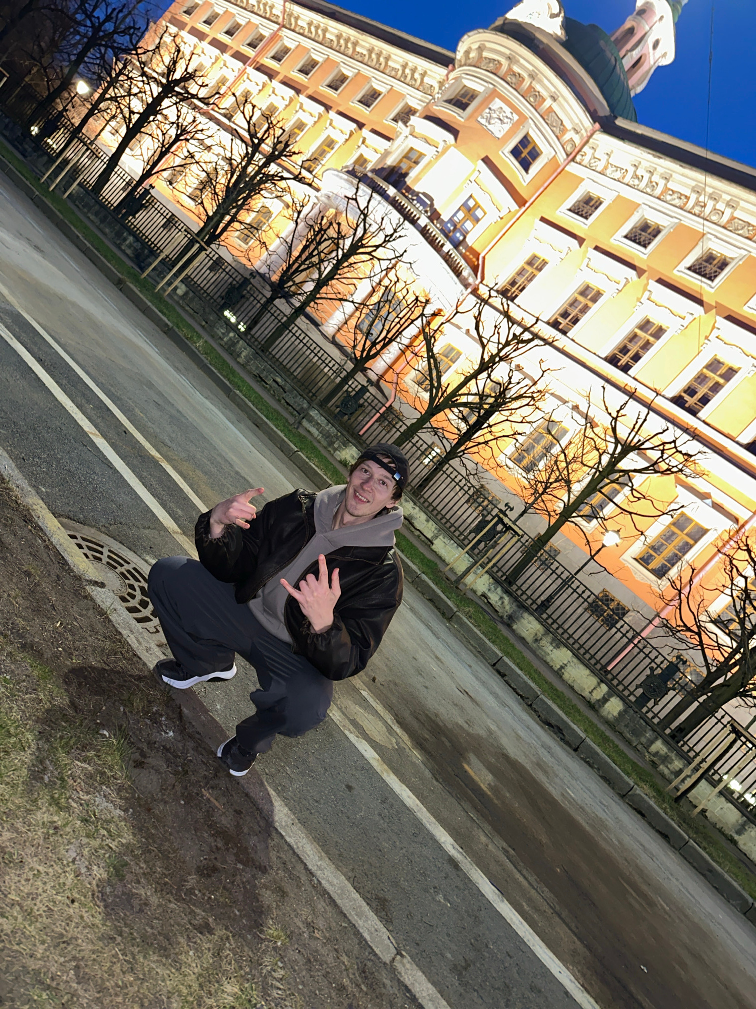 A young man is crouching next to a roadside drain, making hand gestures. He is wearing a black jacket, gray hoodie, black sweatpants, and black and white sneakers. The backdrop is a large, multi-storyβ¦read more
