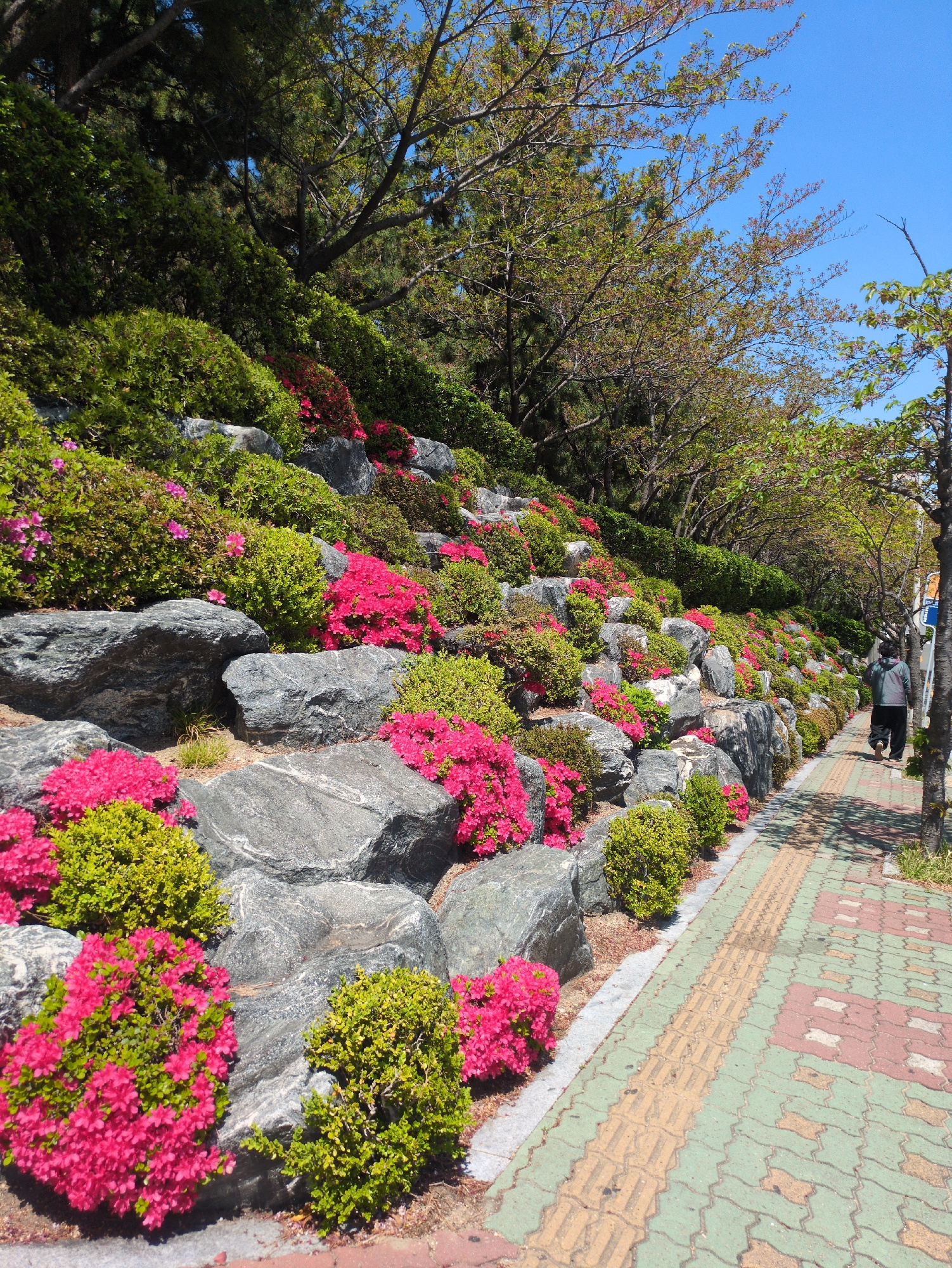 The image depicts a landscaped embankment in Ulsan, South Korea, featuring a retaining wall made of large, grey rocks. Vibrant pink azaleas and green shrubs are planted among the rocks. A pedestrian w…read more