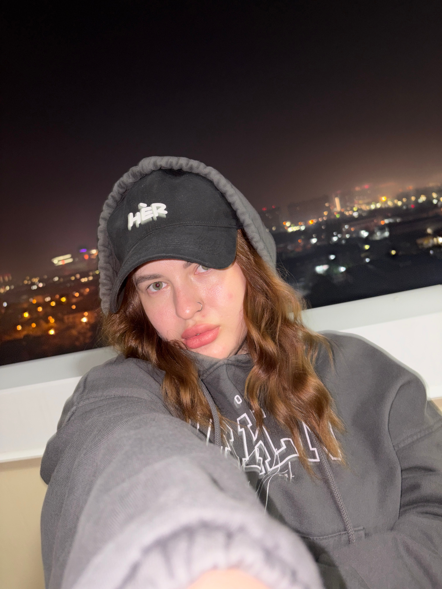 A close-up selfie captures a young person, likely female, tilted to the right, looking directly into the camera. The setting is a nighttime cityscape in Krasnodar, Russia, viewed from a high vantage p…read more