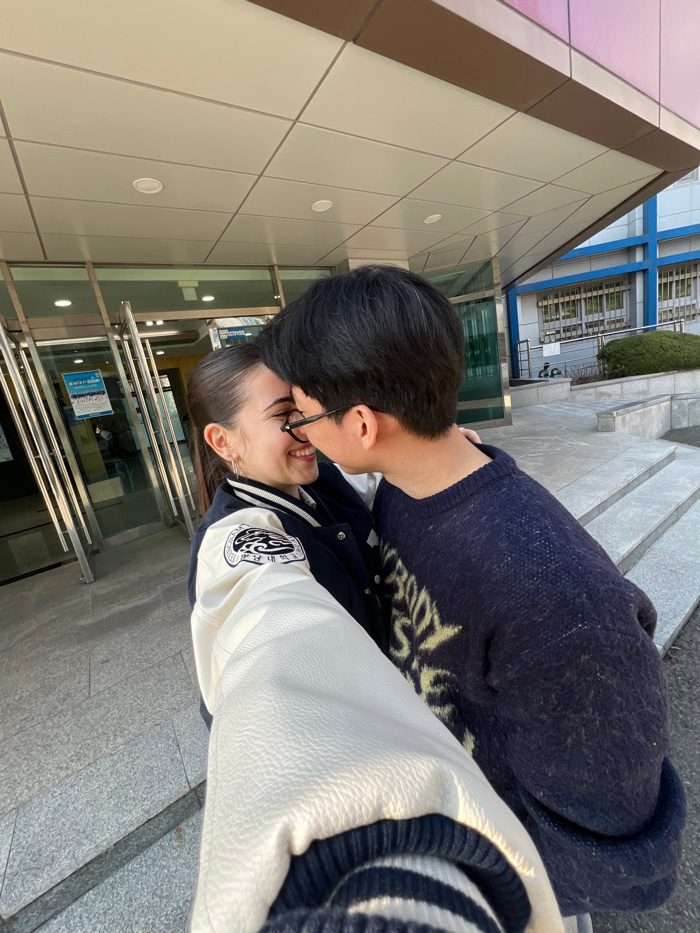 An outdoor selfie portrays two individuals in a close embrace on the campus of Keimyung University in Daegu, South Korea. The scene is set before the entrance of a modern university building, featurin…read more