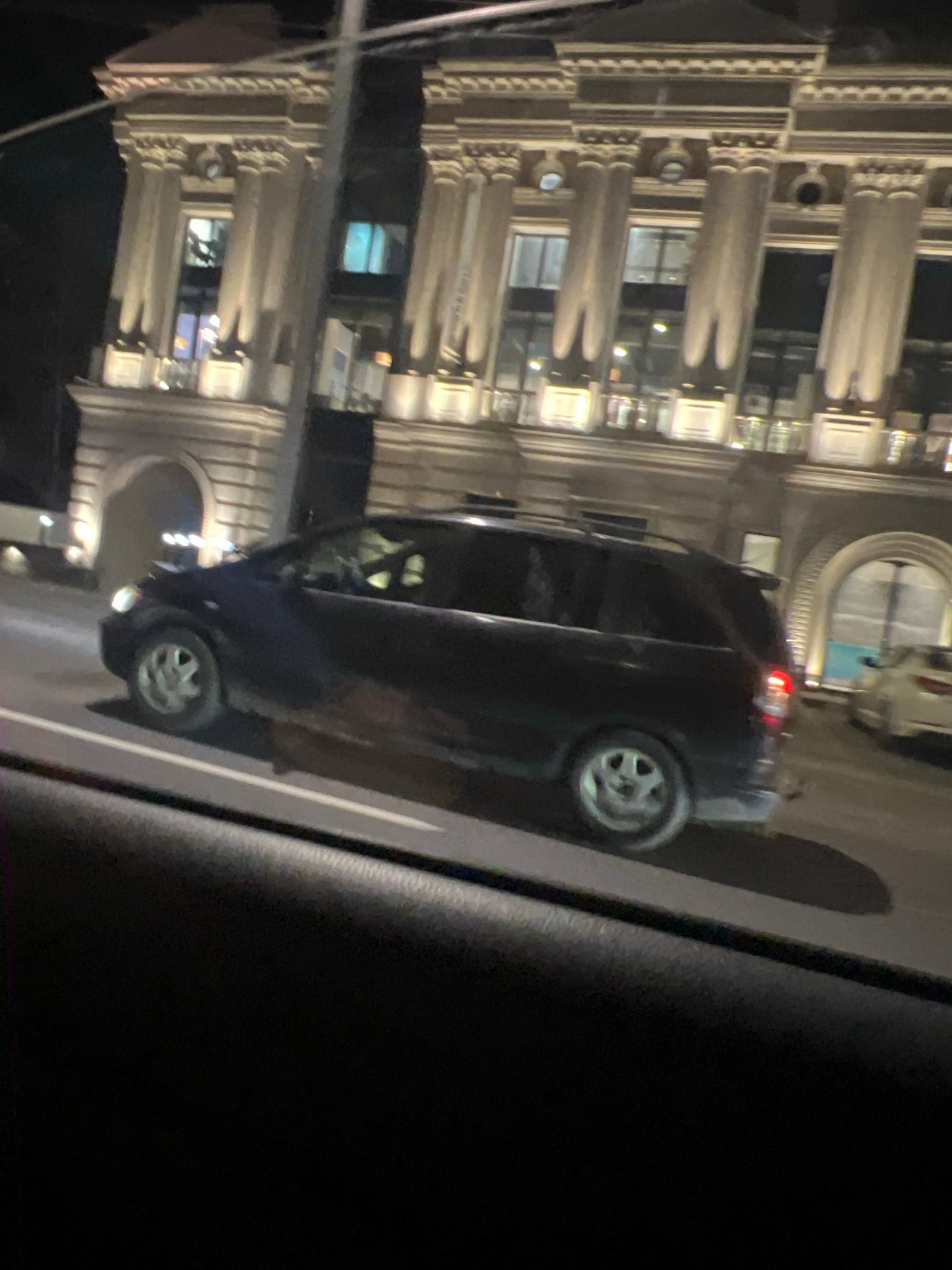 A night shot taken from inside a vehicle shows a black car on a street in Yerevan, Armenia. The car is driving past a large building with prominent columns and arched windows. The building is illumina…read more