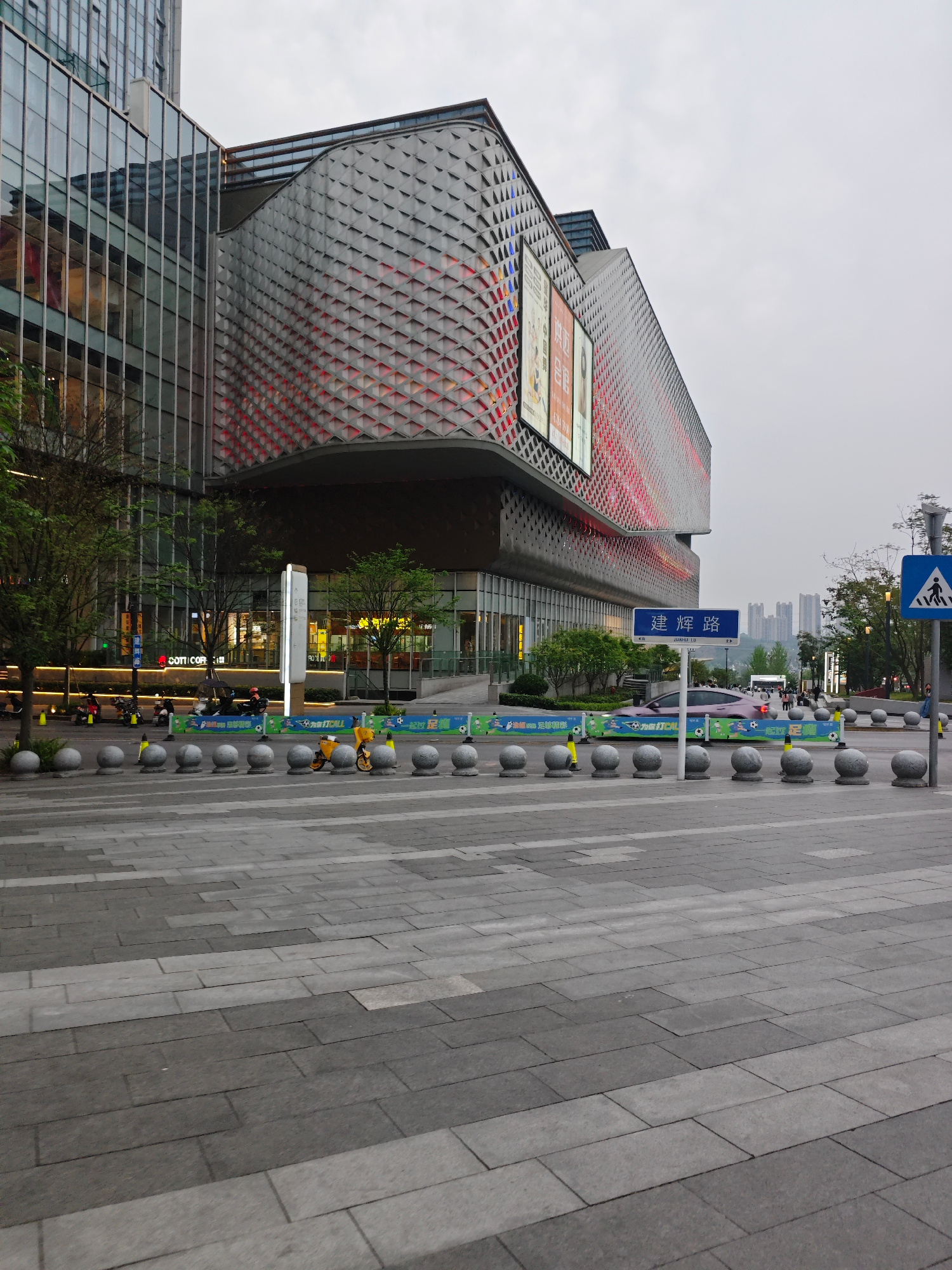 The image depicts an urban scene in Liangjiang, China. A modern building with a tessellated facade dominates the left side of the frame, adjacent to a glass-clad structure. Across a wide, paved pedest…read more