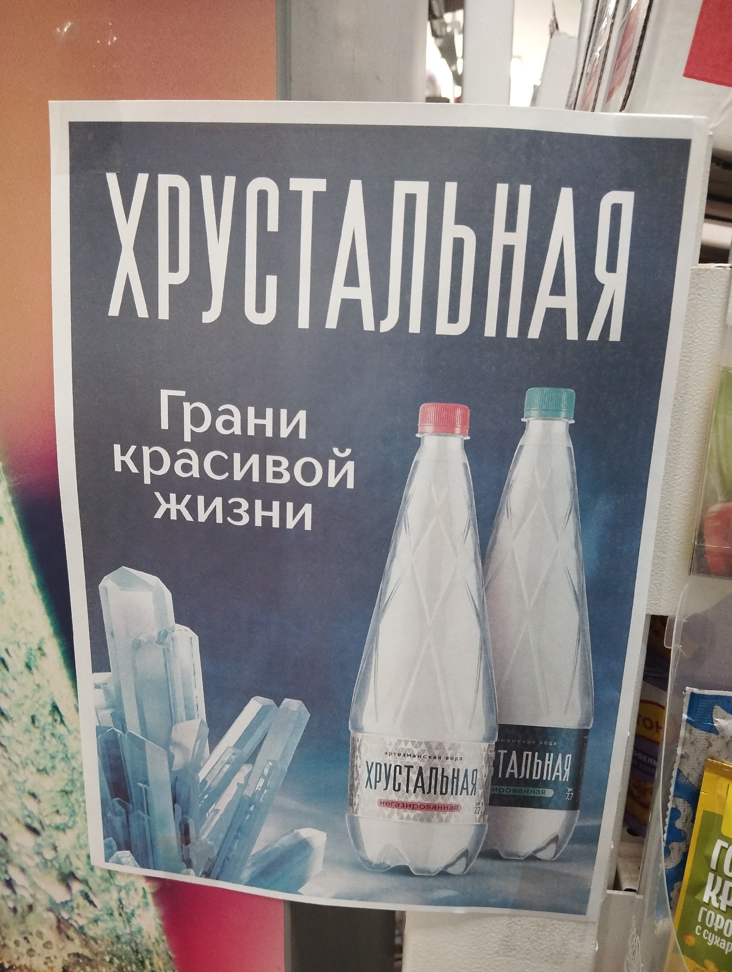 A poster for ХРУСТАЛЬНАЯ water, likely in a store in Krasnogorskoye, Russia. The poster has a gray background with white text reading "ХРУСТАЛЬНАЯ" at the top and "Грани красивой жизни" below. Two bot…read more