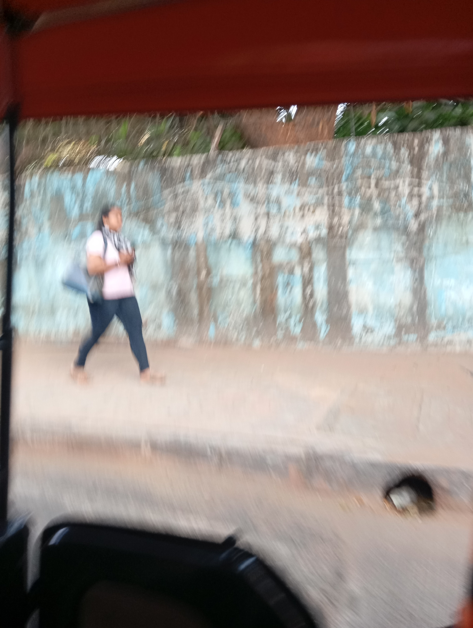 A woman walks along a sidewalk in Mumbai, India. She wears a light pink shirt, dark pants, and sandals, and carries a blue tote bag. Behind her is a weathered wall with peeling paint. The photo was ta…read more