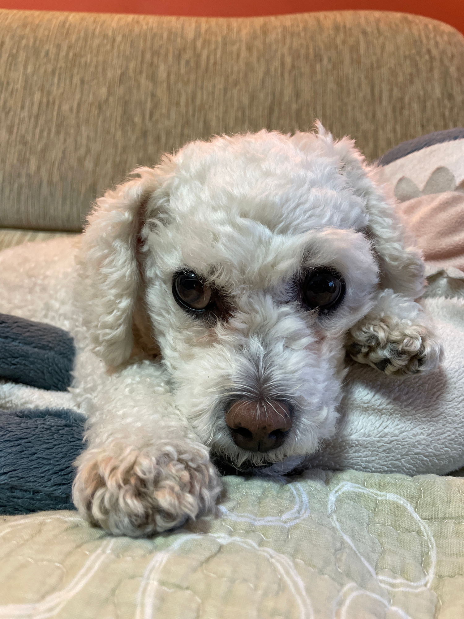 A small, white, fluffy dog with dark eyes and a pinkish-brown nose is lying on its side on a light-colored cushion or blanket. The dog is facing the camera. The background includes a patterned blanket…read more